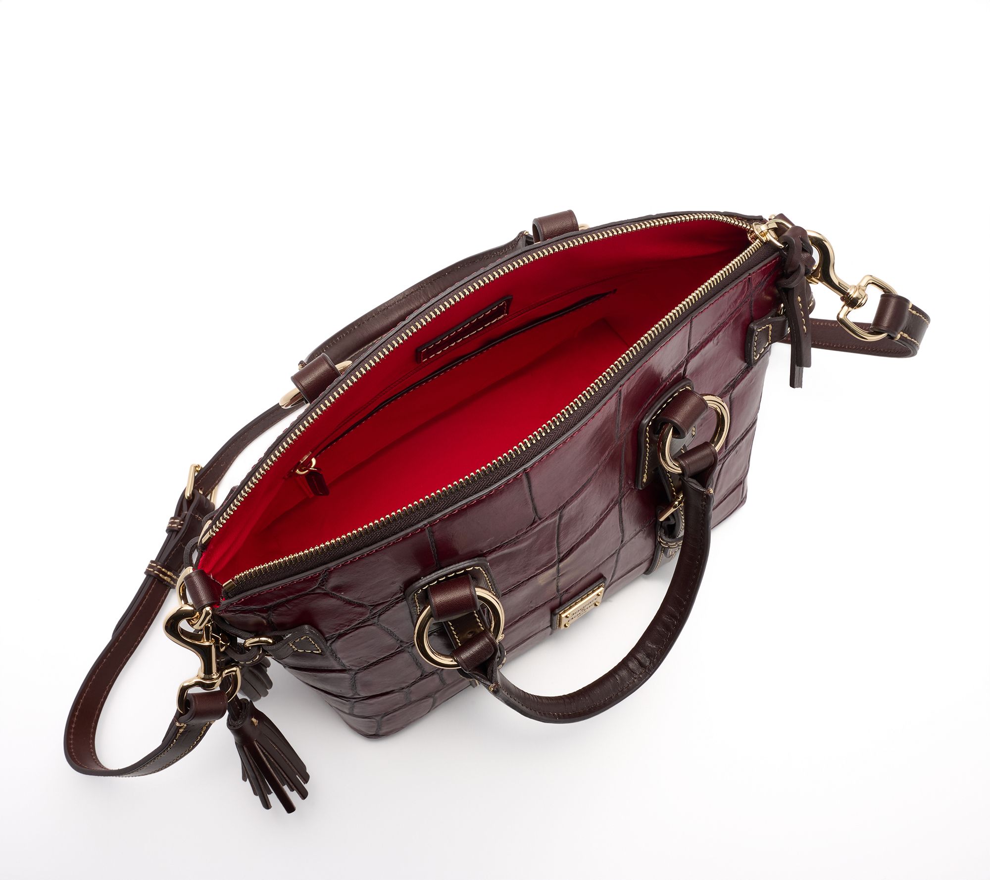 Whether you are headed to brunch or off to work, the Denison Croc Bristol satchel from Dooney & Bourke is designed to keep everything organized and close at hand. A structured shape with polished croc-embossed leather offers timeless style, while multiple pockets, a key hook, and an adjustable strap help you move from handheld to shoulder carry with ease. From Dooney & Bourke.