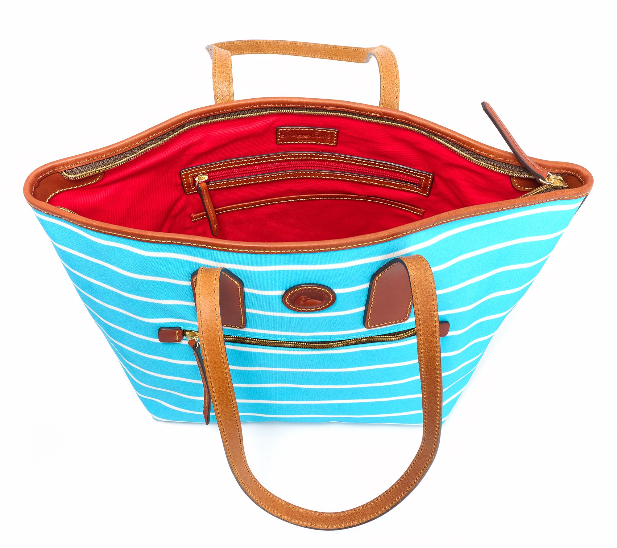 Stay organized on weekday commutes or weekend outings with this fashionable tote, crafted from lightweight nylon and finished with soft leather trim for a stylish touch. You'll love the easy-access exterior zip pocket for keys and essentials, along with a spacious interior to house your other belongings. From Dooney & Bourke.