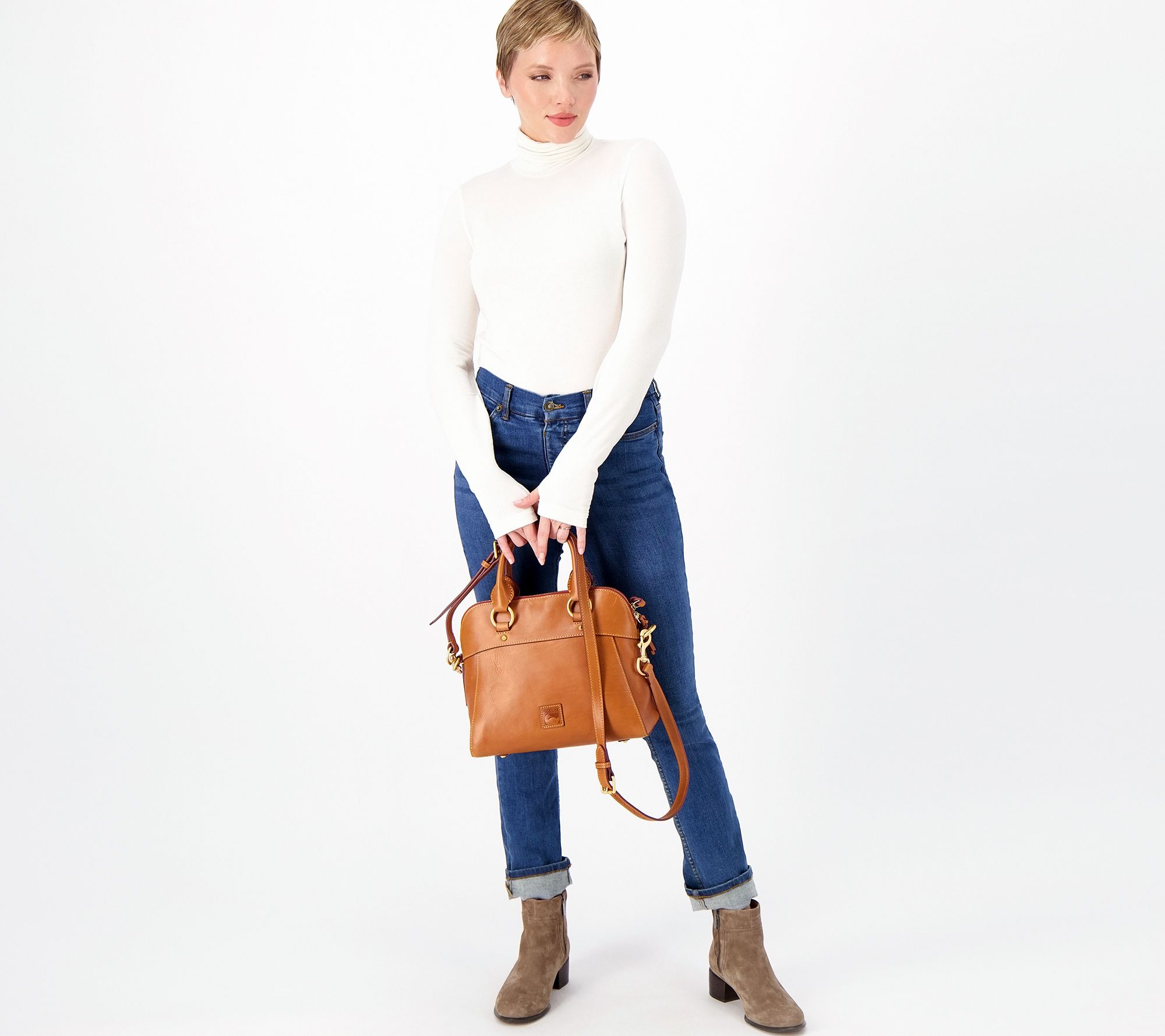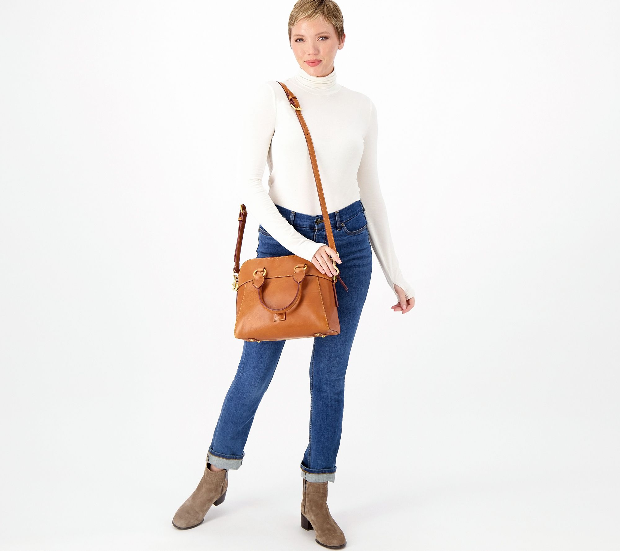 This gorgeous Florentine leather satchel is conveniently equipped with both double handles and an adjustable, removable shoulder strap. Wear it with any outfit that could use an extra dose of sophistication. From Dooney & Bourke.