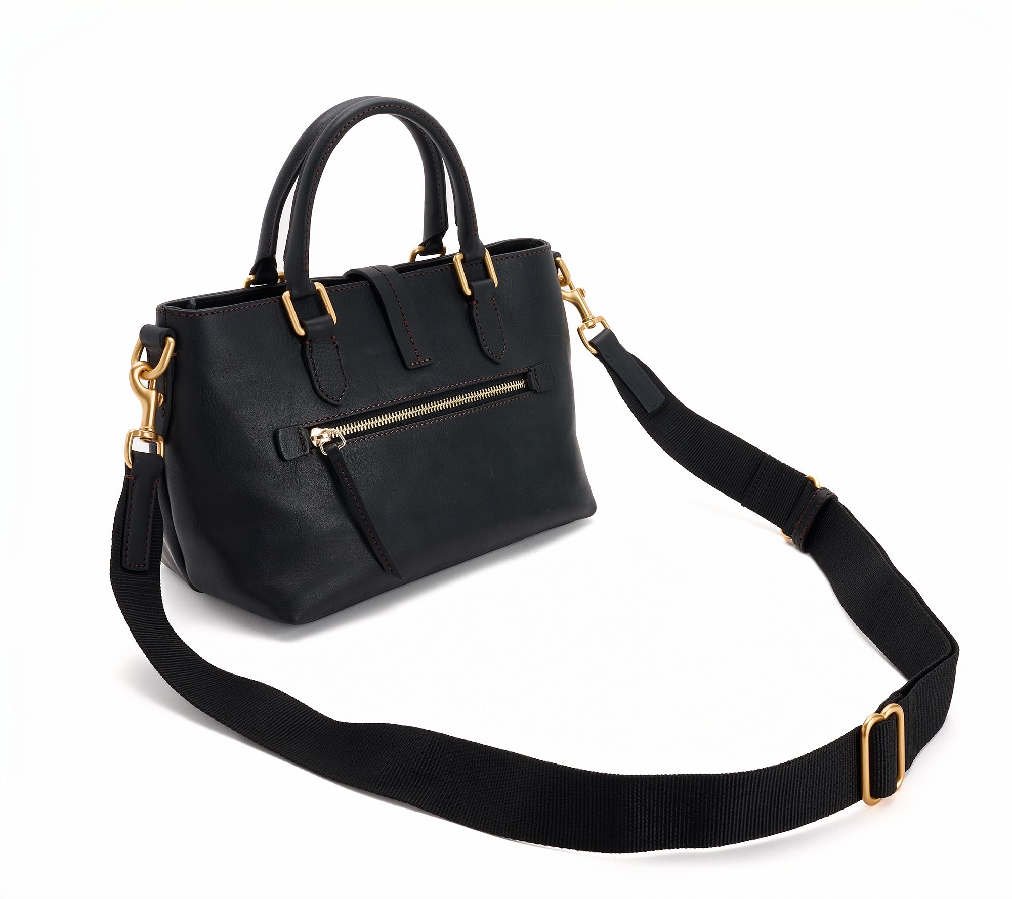 Double handles, removable/adjustable strap, dual closure with turnlock and zipper, leather patch logo, back zip pocket, four feet