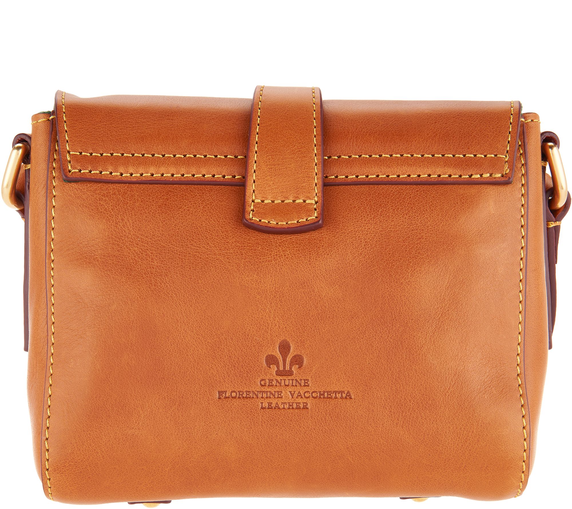 • Florentine leather body, adjustable strap, logo lock closure, four bottom feet, goldtone hardware