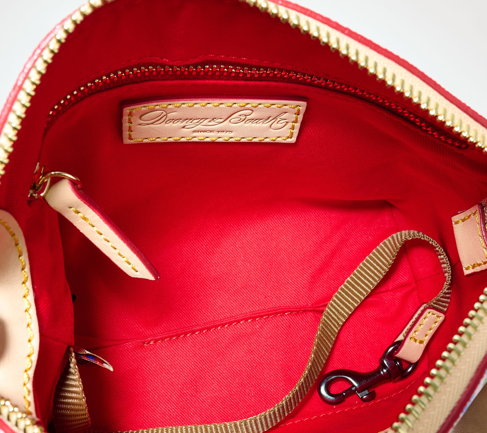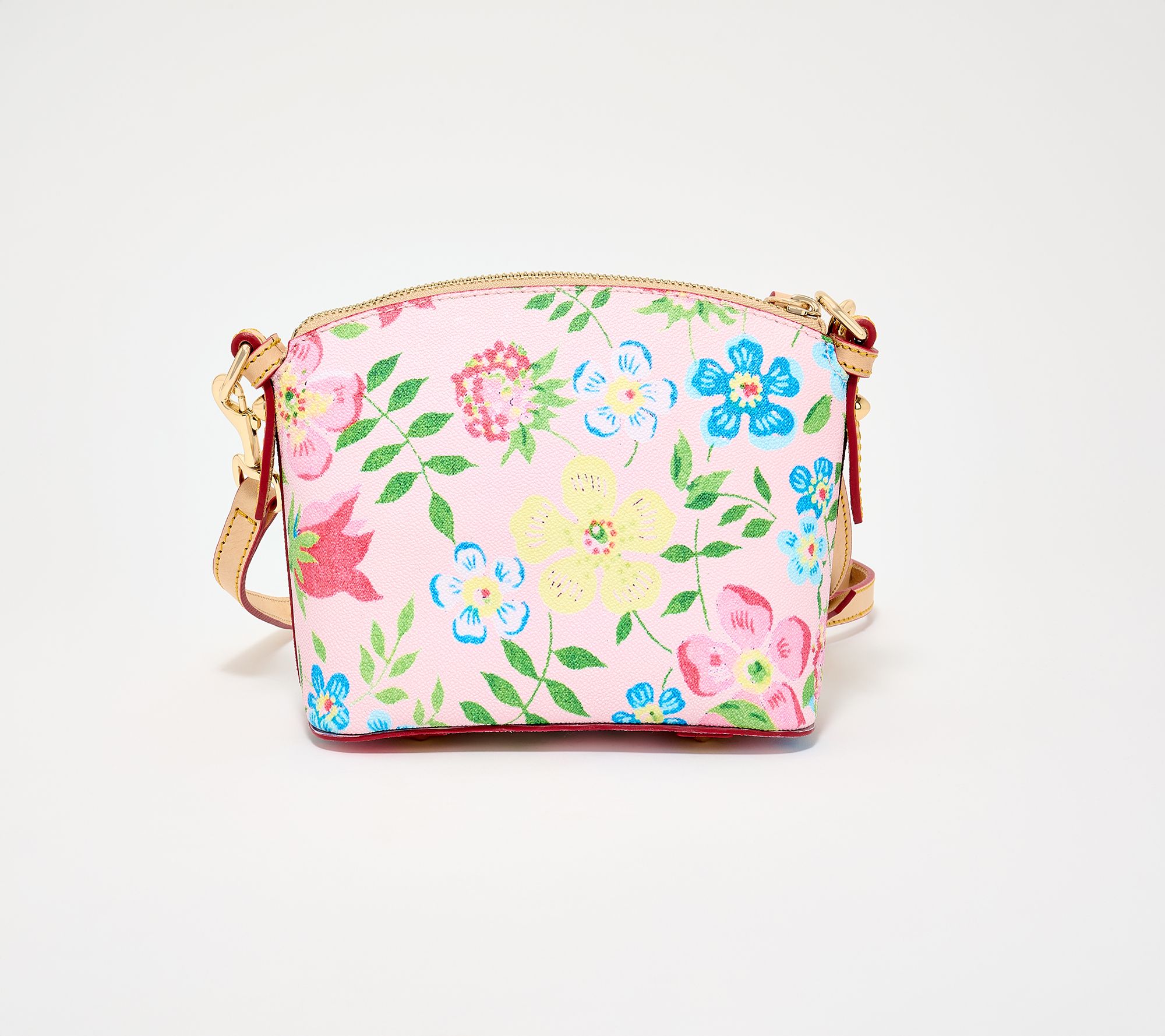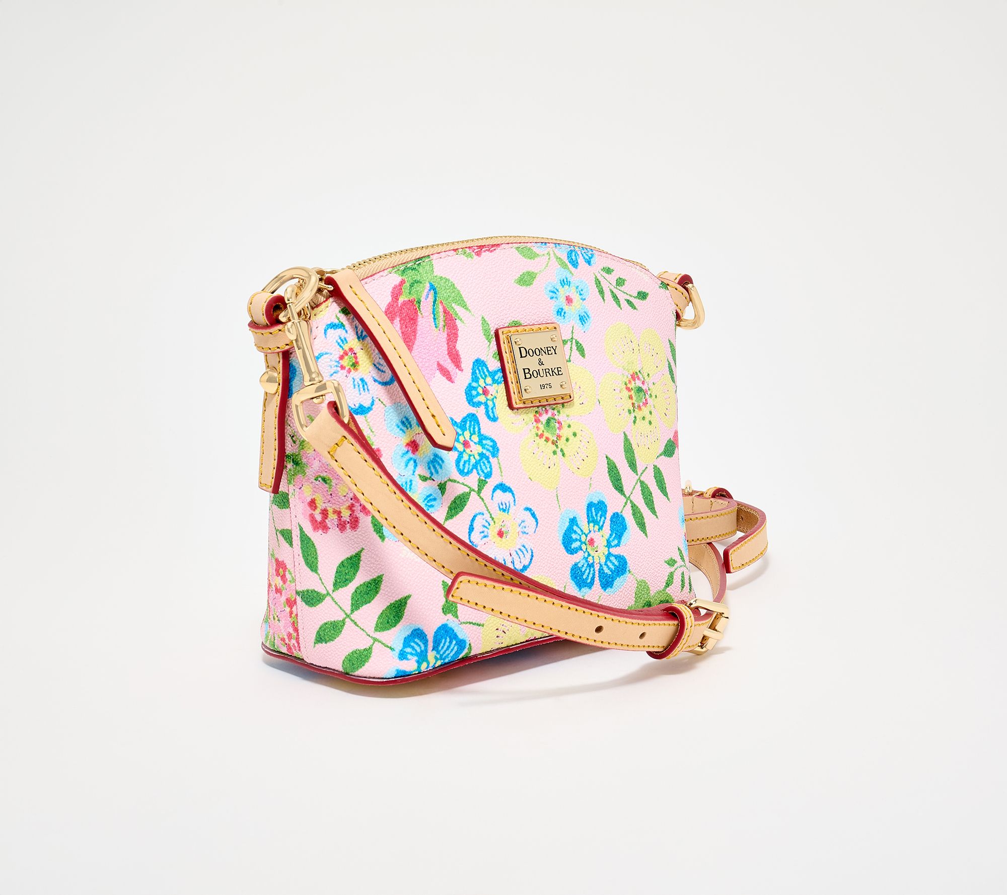 Send yourself flowers! The vibrant floral print of this mini domed crossbody instantly brightens your day. Effortlessly transition from brunch to errands, keeping your essentials within reach thanks to a handy interior zip pocket and key hook. Carry it by the adjustable strap or style it as a handheld for added versatility. From Dooney & Bourke.