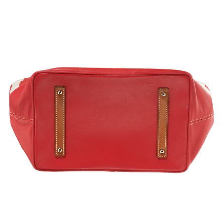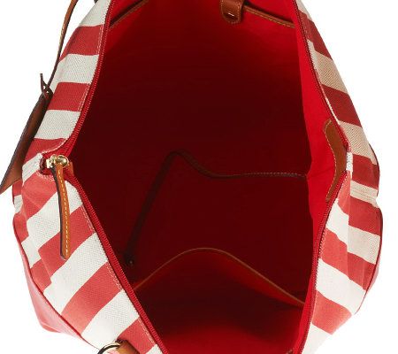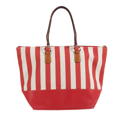 Summer love. With a classic warm weather fabric and design, this shopper is ideal for running errands, a day at the pool, or trip to the beach. With a zip-top closure and plenty of storage space, it'll carry you fashionably through the season. From Dooney & Bourke.