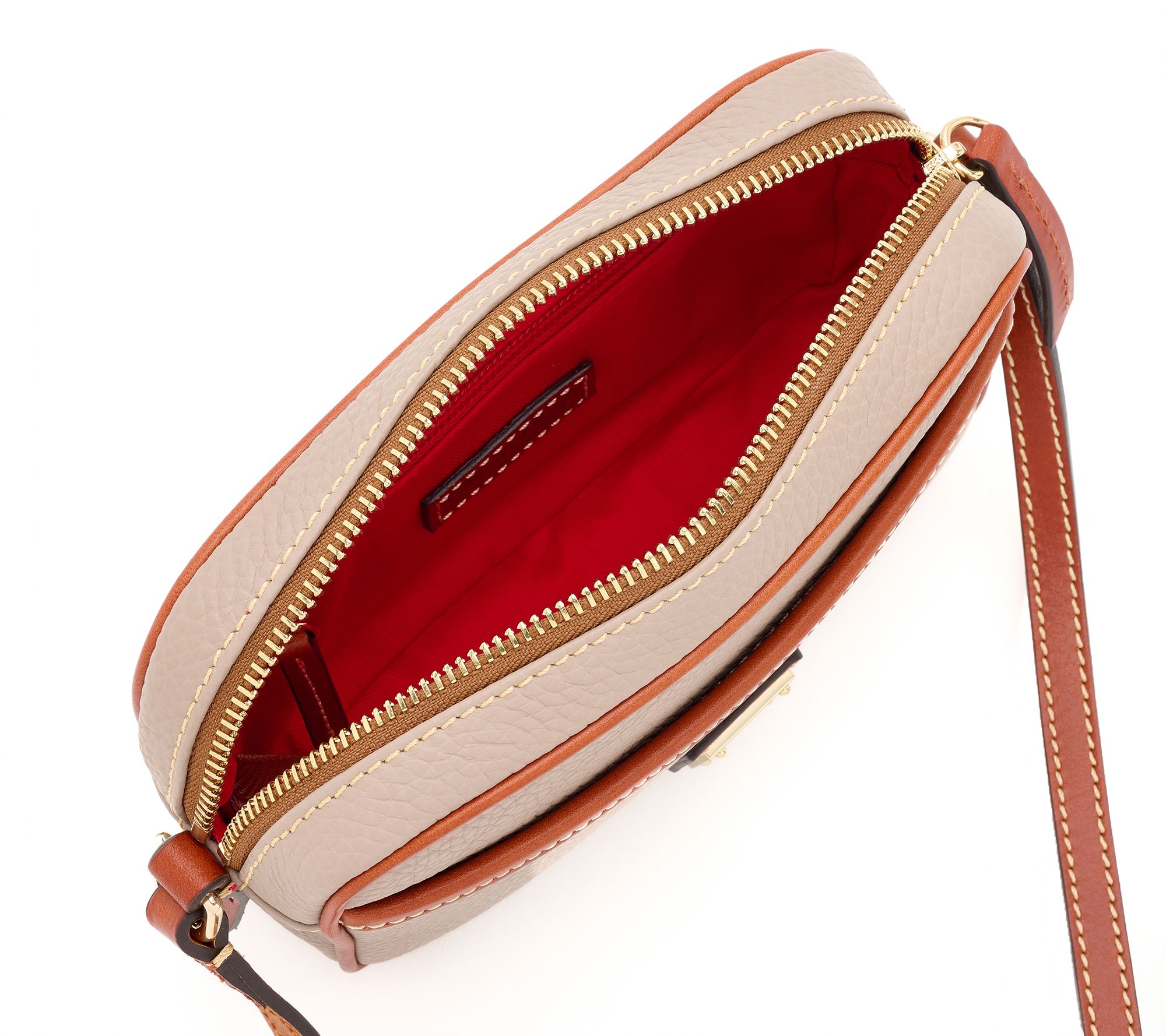 Pebble leather exterior, adjustable crossbody strap, camera silhouette, zipper closure, front slip pocket