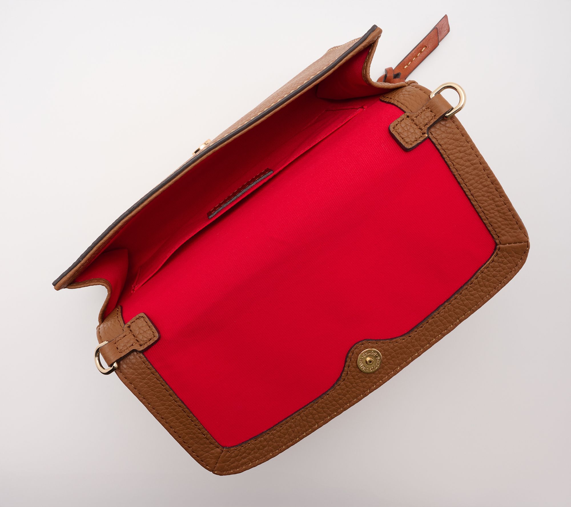 Pebble leather body, front flap compartment, back zip compartment, adjustable shoulder strap, converts from wallet/clutch to crossbody