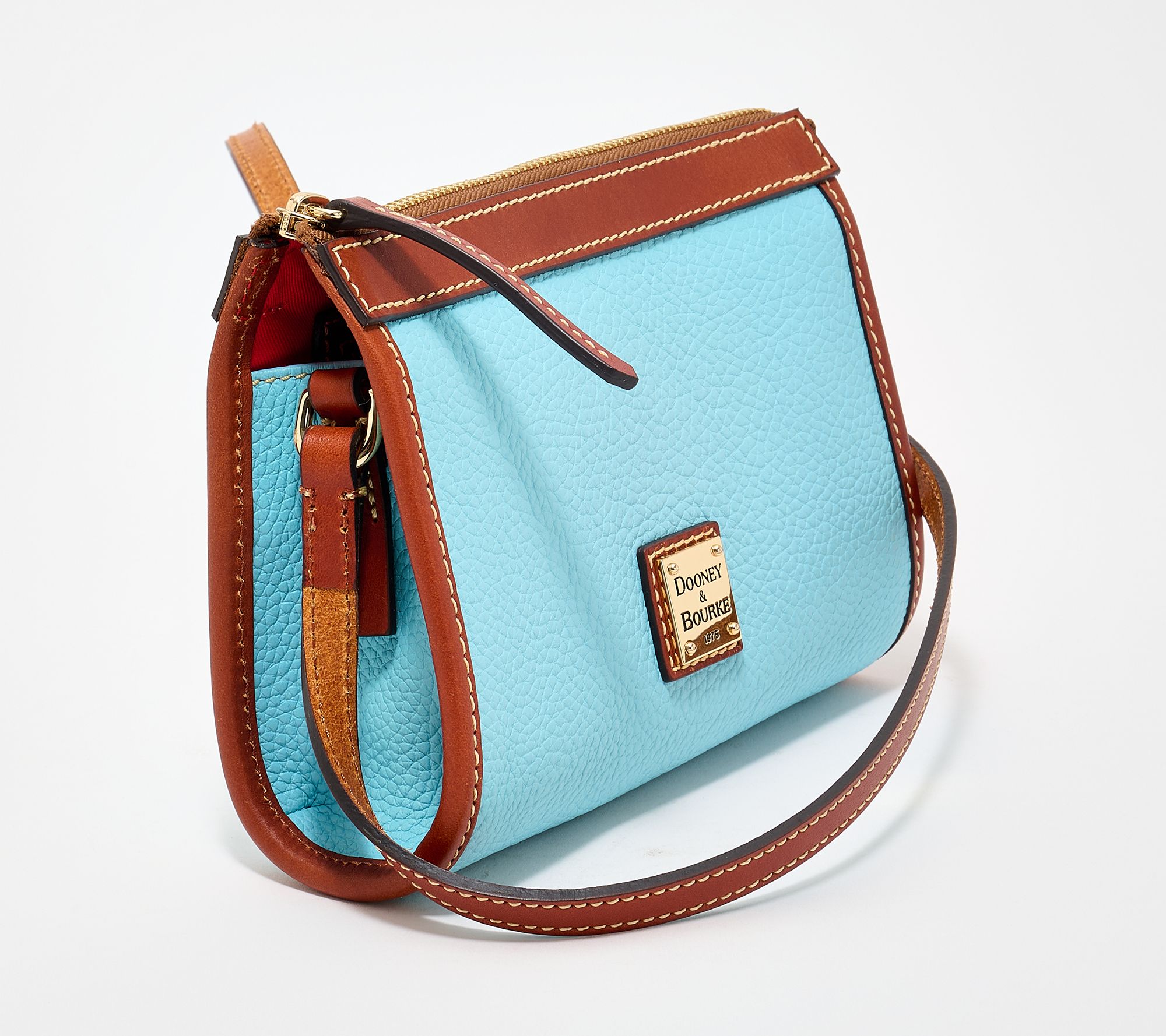 Pebble leather, zipper closure, crossbody strap
