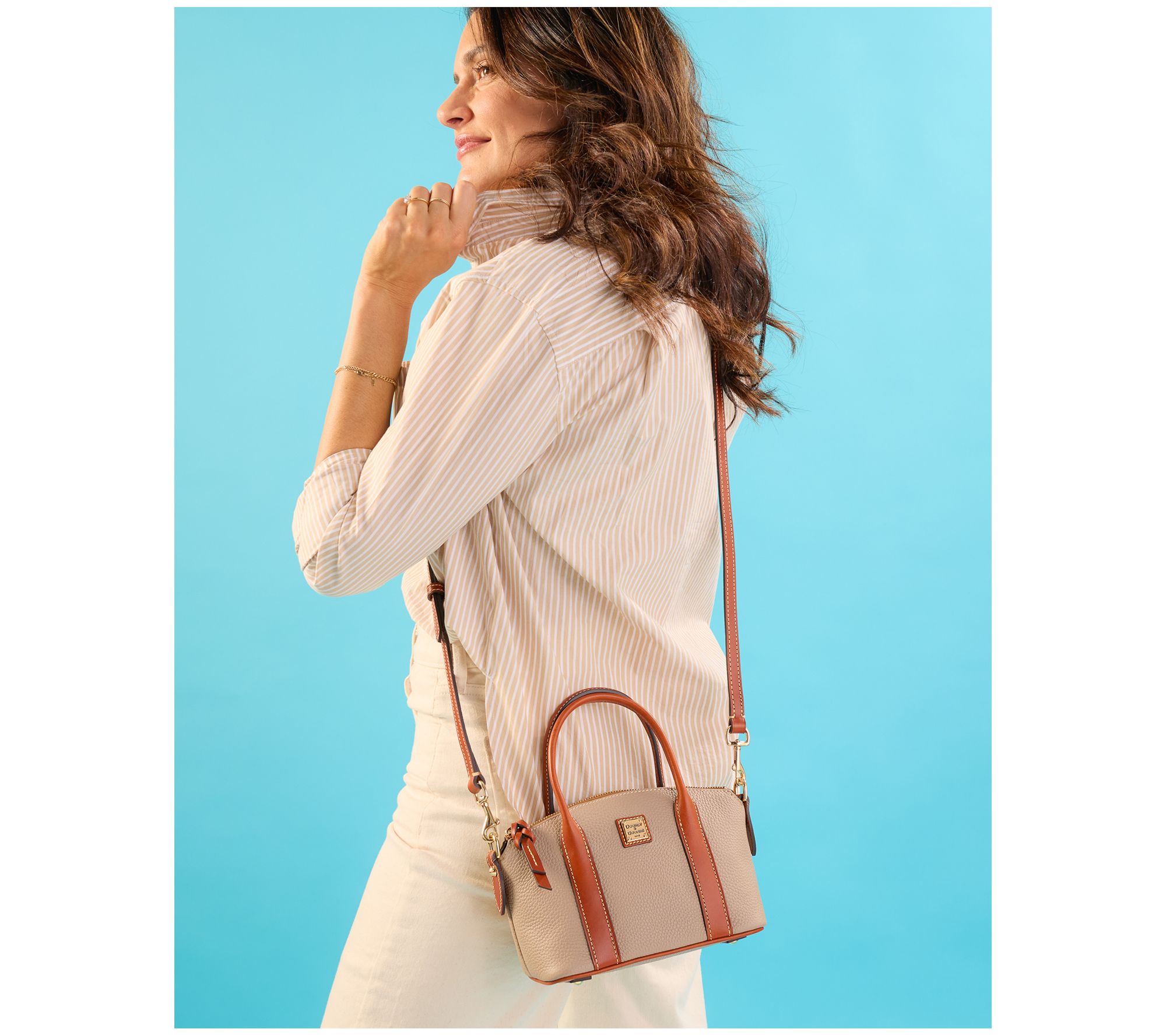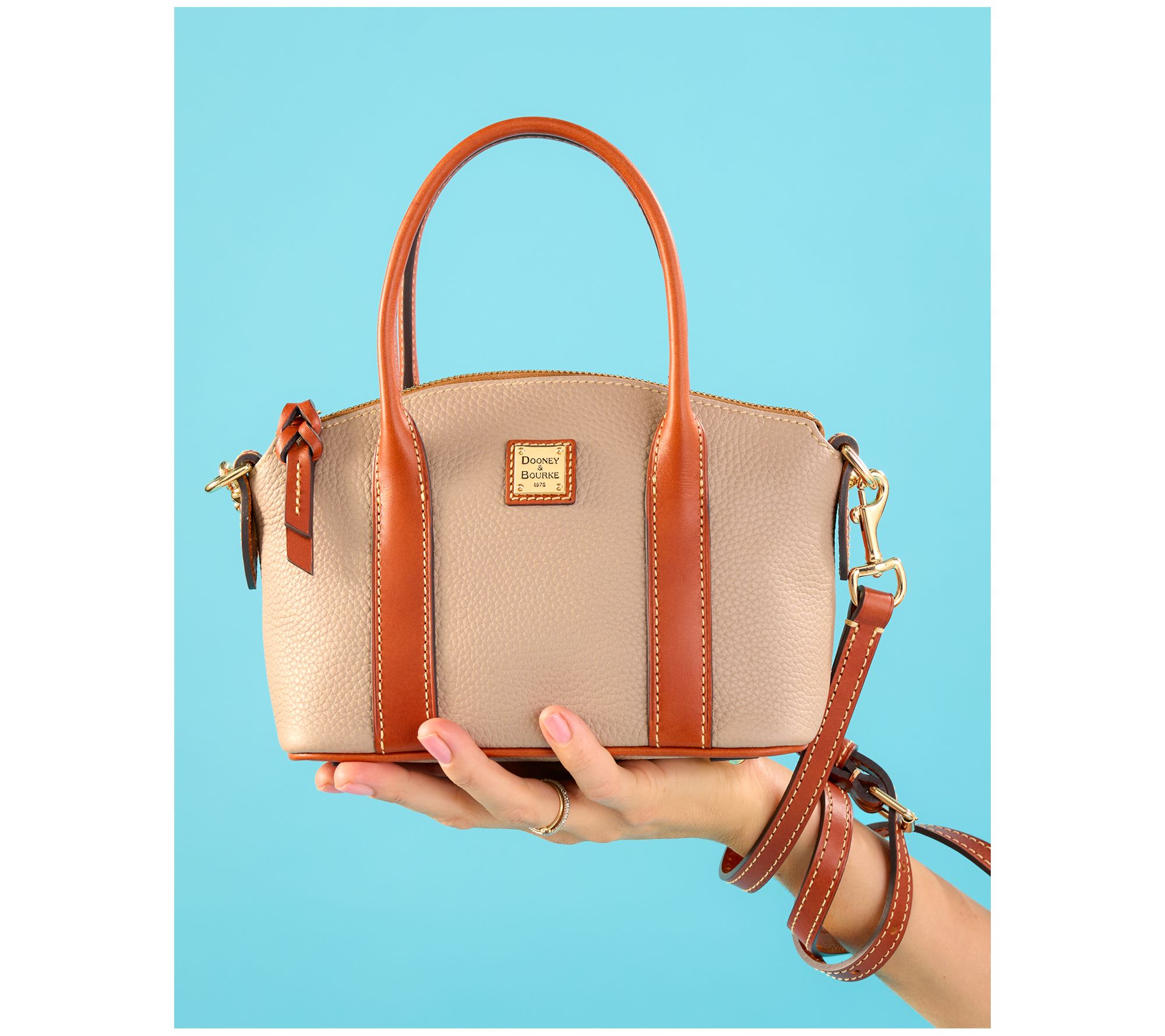 A small satchel with serious appeal. From the luxe pebble leather body to the smooth classic trim, the Dooney & Bourke Madeline satchel gives you a top-of-the-world feeling every time you carry it. While the stylish design speaks for itself, don't forget the inside that has plenty of room and pockets to keep you completely organized. From Dooney & Bourke.