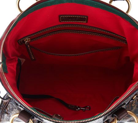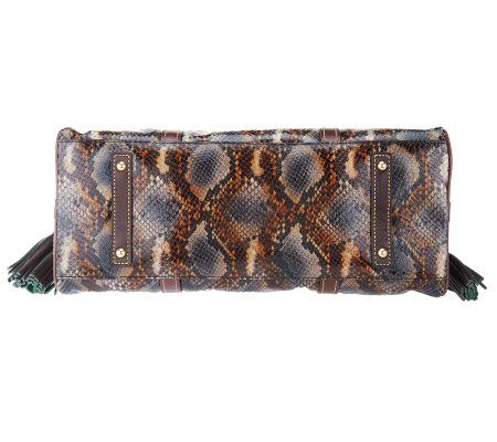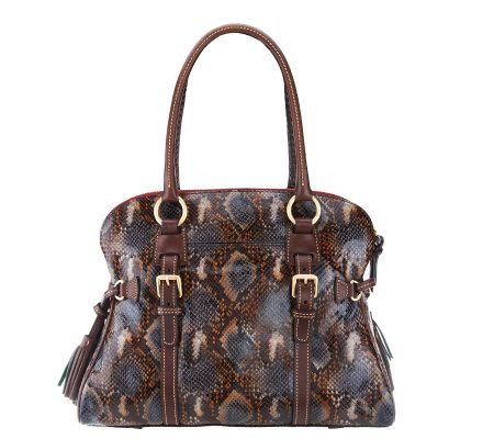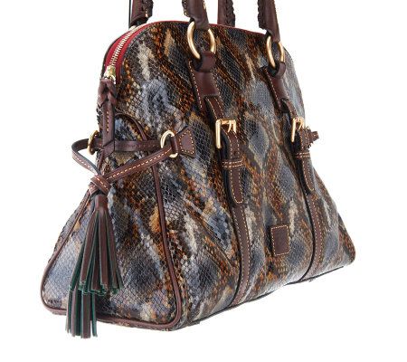 The antidote to the ordinary bag. Rich with style and texture, this satchel's python embossing, eye-catching tassels, and beautiful domed shape will give you the luxe look you've been after. From Dooney & Bourke.