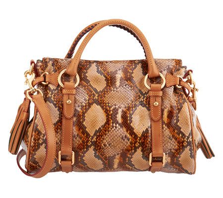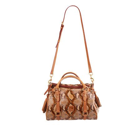 Smart sophistication with a touch of sass. This leather satchel is contemporary with a python-embossed body, double handles, and an adjustable shoulder strap. From Dooney & Bourke.