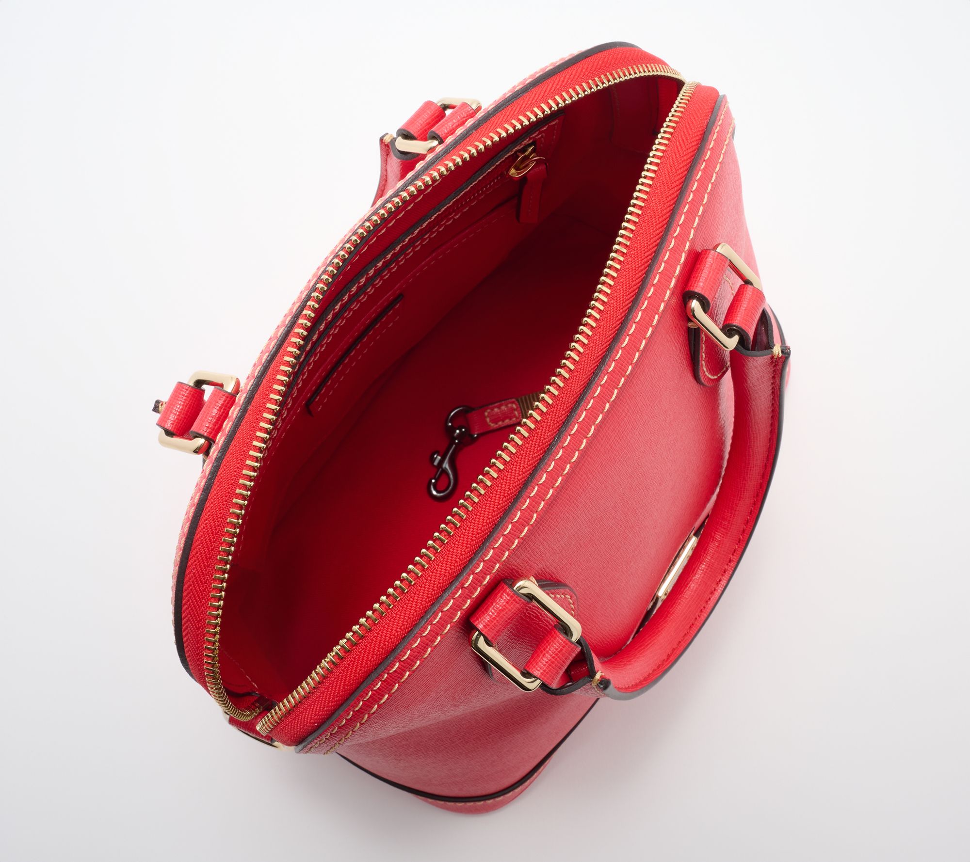 Saffiano leather body, zip closure, double handles, adjustable and removable crossbody strap, metal-plated logo