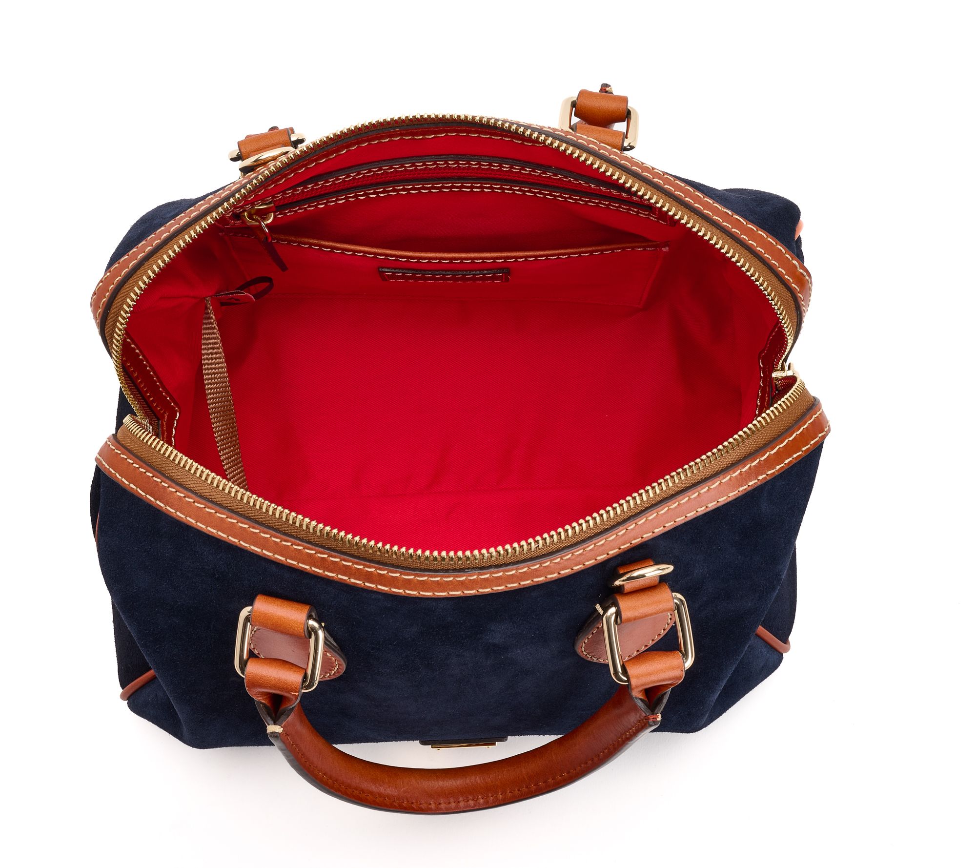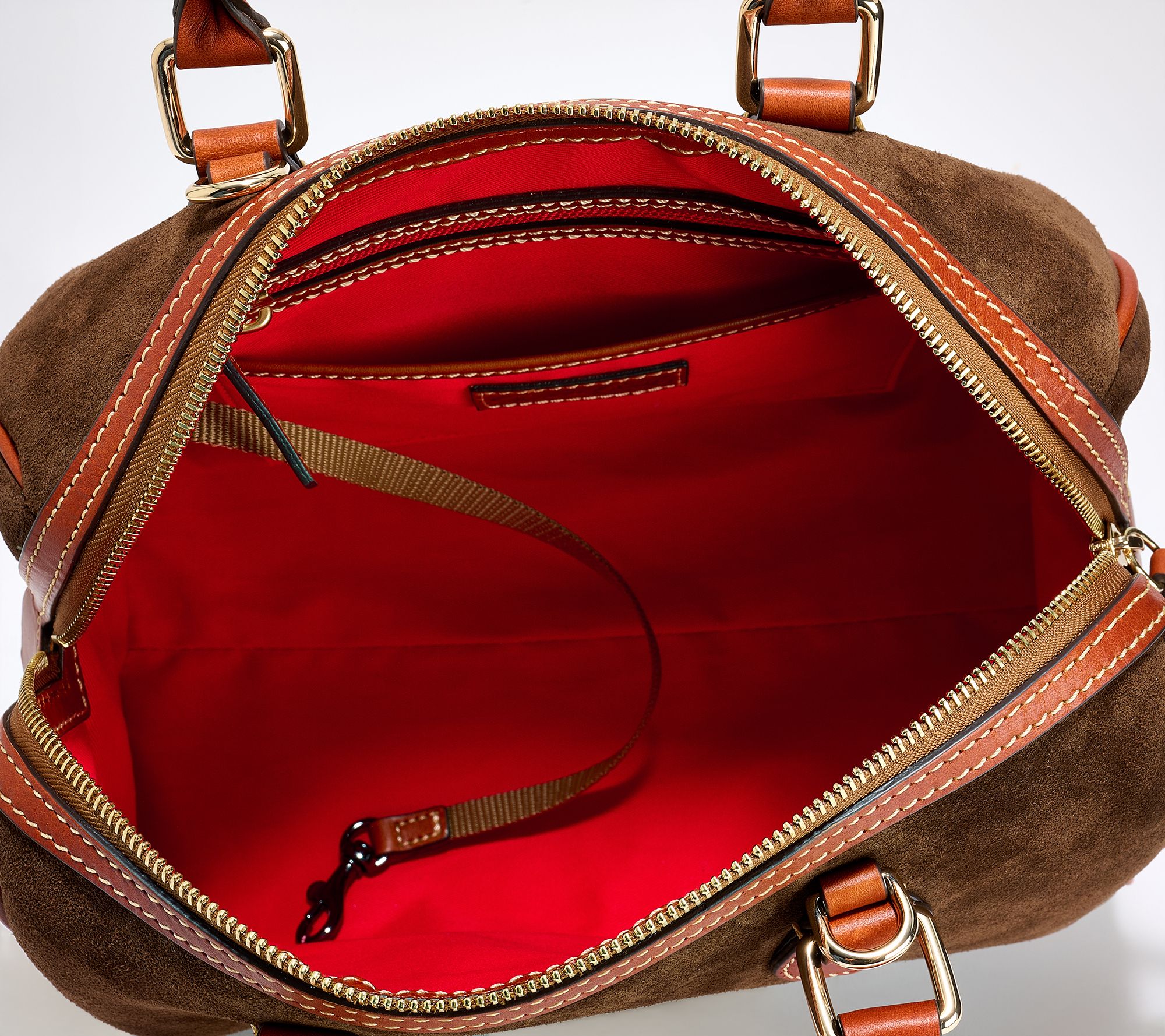 Roomy yet refined, this suede barrel satchel is your go-to bag for travels near and far and holding your essentials closer to home. Carry it anyway that's comfortable, thanks to top handles and a removable/adjustable shoulder strap. There's nowhere this elevated design won't go... and nothing gets left behind. From Dooney & Bourke.