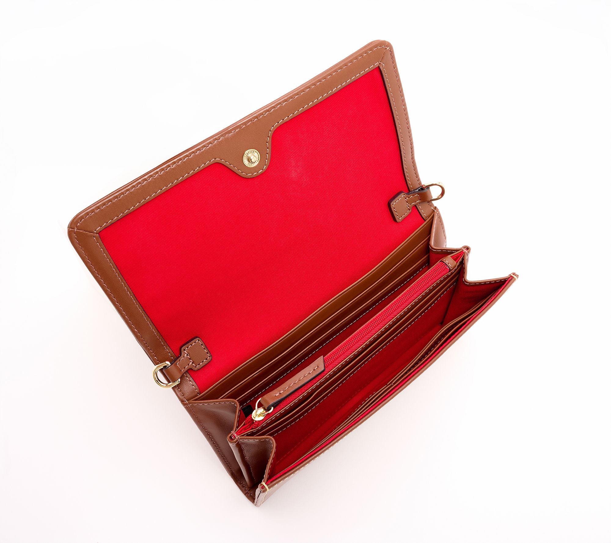 Lined interior, built-in wallet with six card slots, zip pocket, five pockets