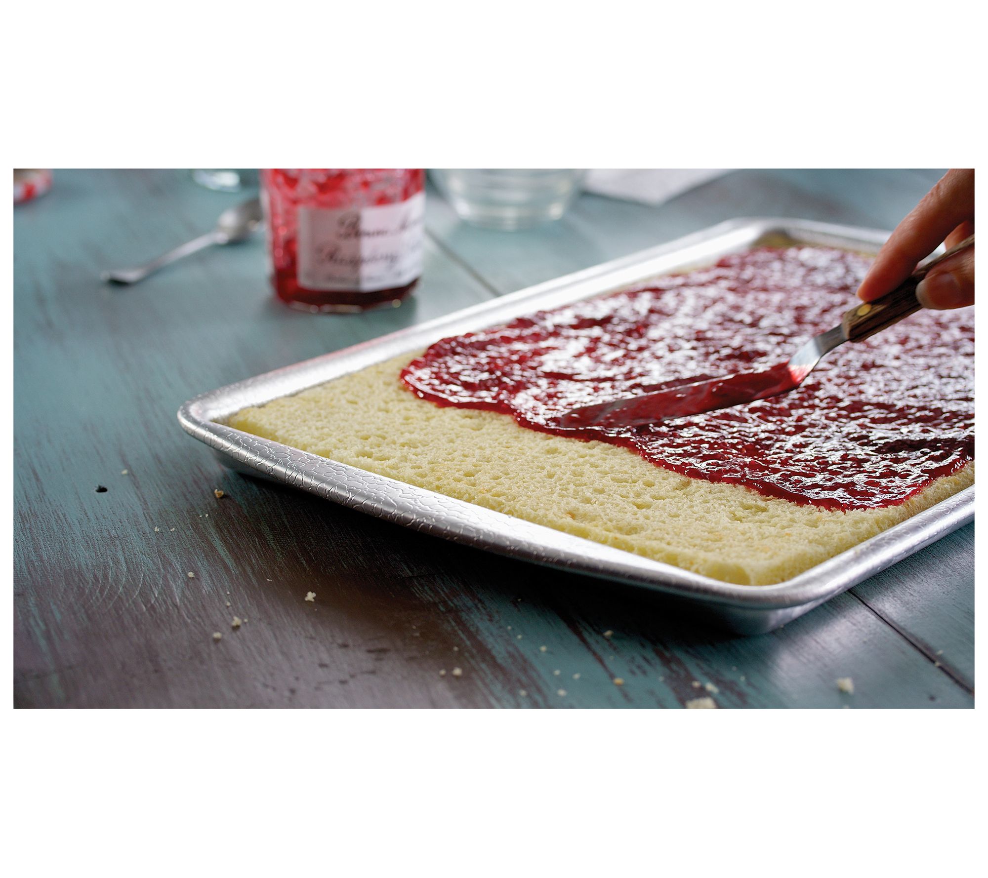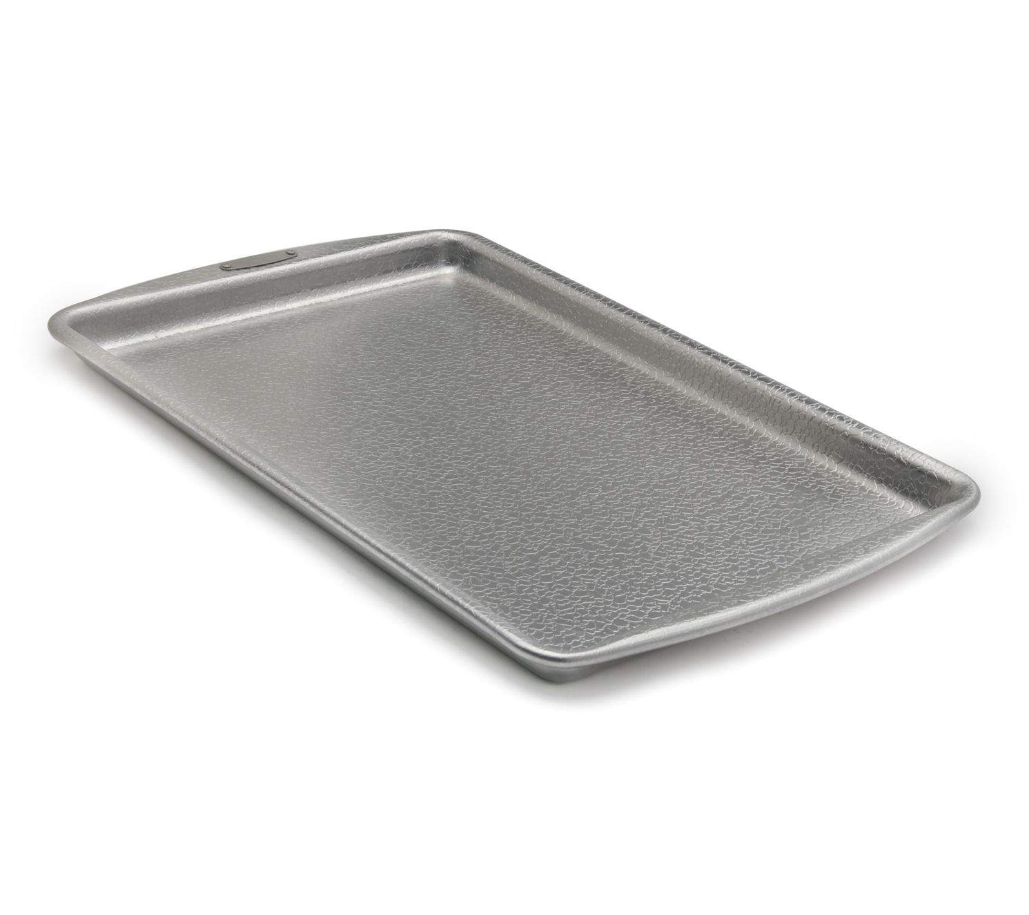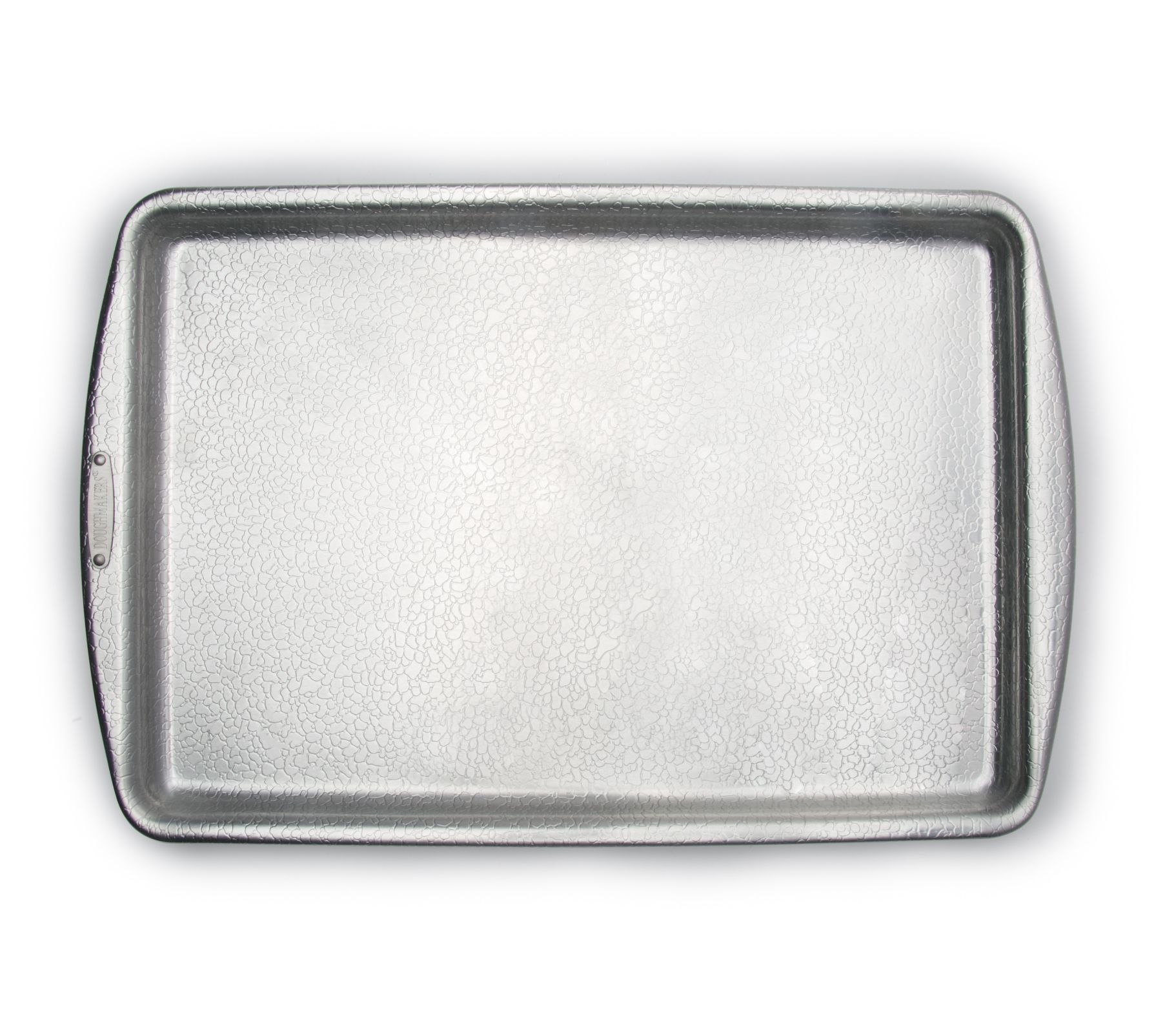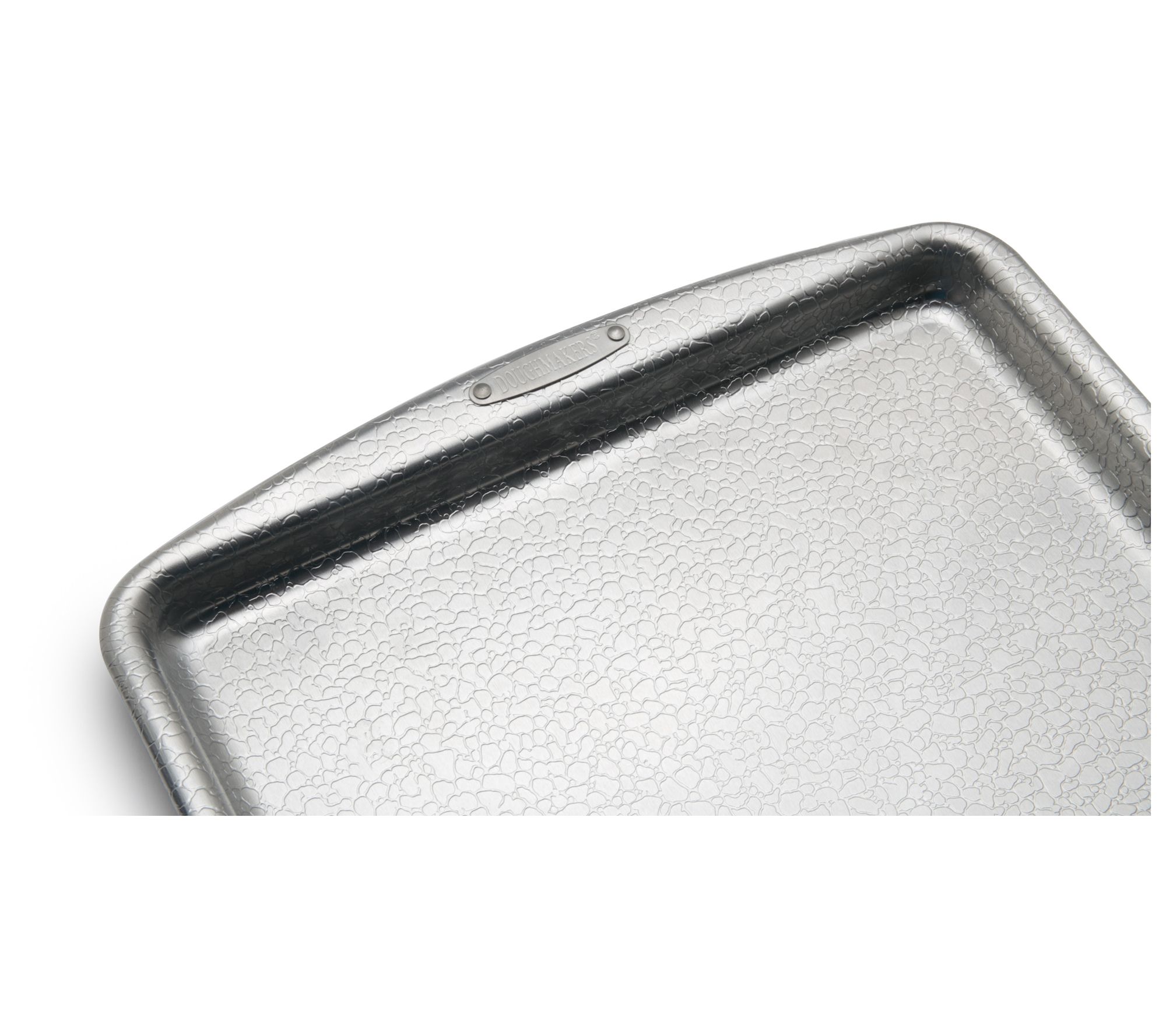 Bake your favorite treats to perfection with the professional-grade Doughmakers jelly roll pan. Ideal for everything from jelly rolls to cookies, this pan ensures even baking with its unique pebble pattern. The reinforced rolled edges prevent warping, making this a durable addition to your kitchen. From Doughmakers.