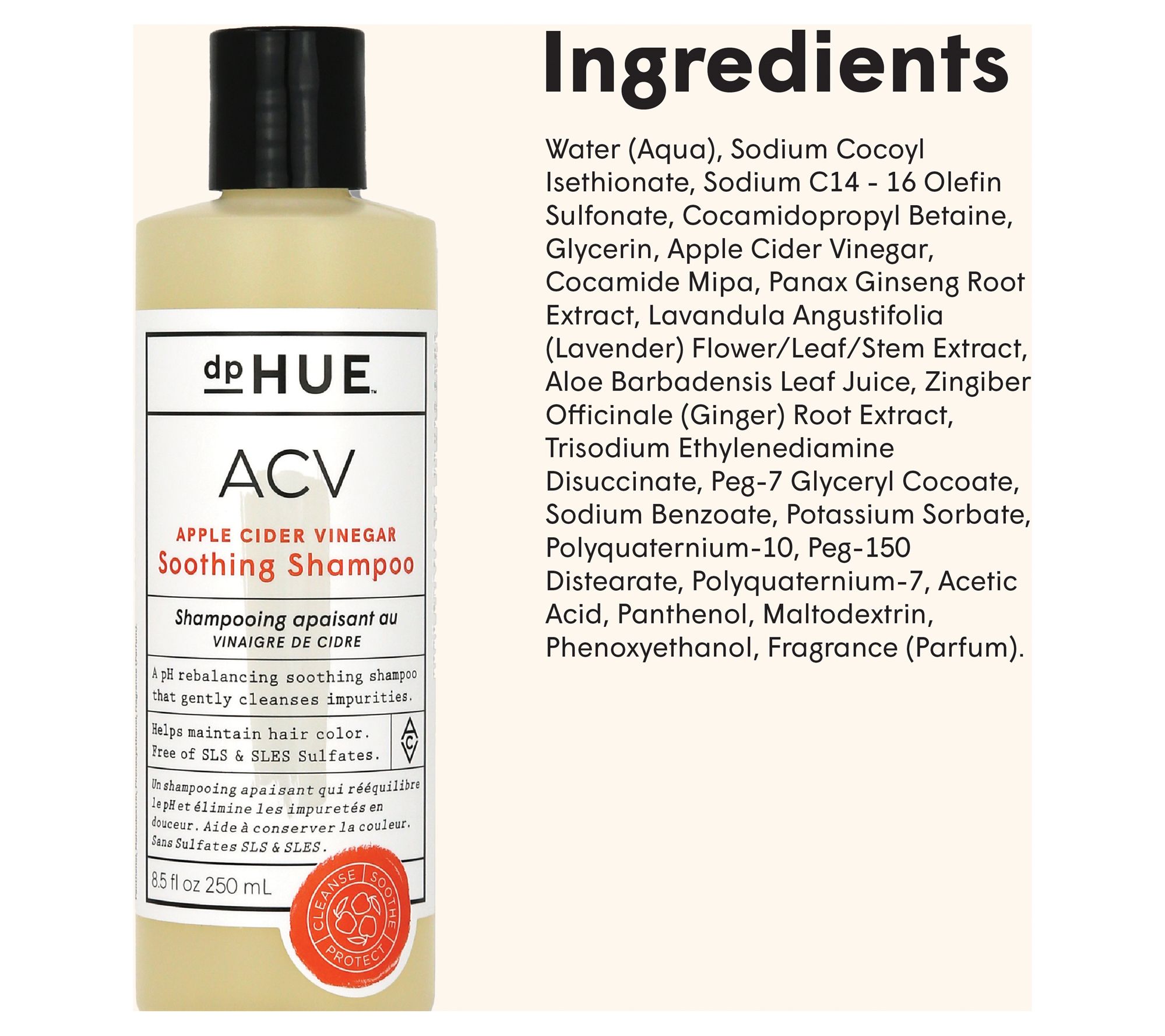 Apple Cider Vinegar Soothing Shampoo cleanses and removes impurities from hair. ACV Soothing Shampoo contains additional cleansing agents to get the clean you are looking for with a traditional shampoo, while still containing Apple Cider Vinegar. It has a medium lather level vs. the low lather level of the ACV Hair Rinse.
