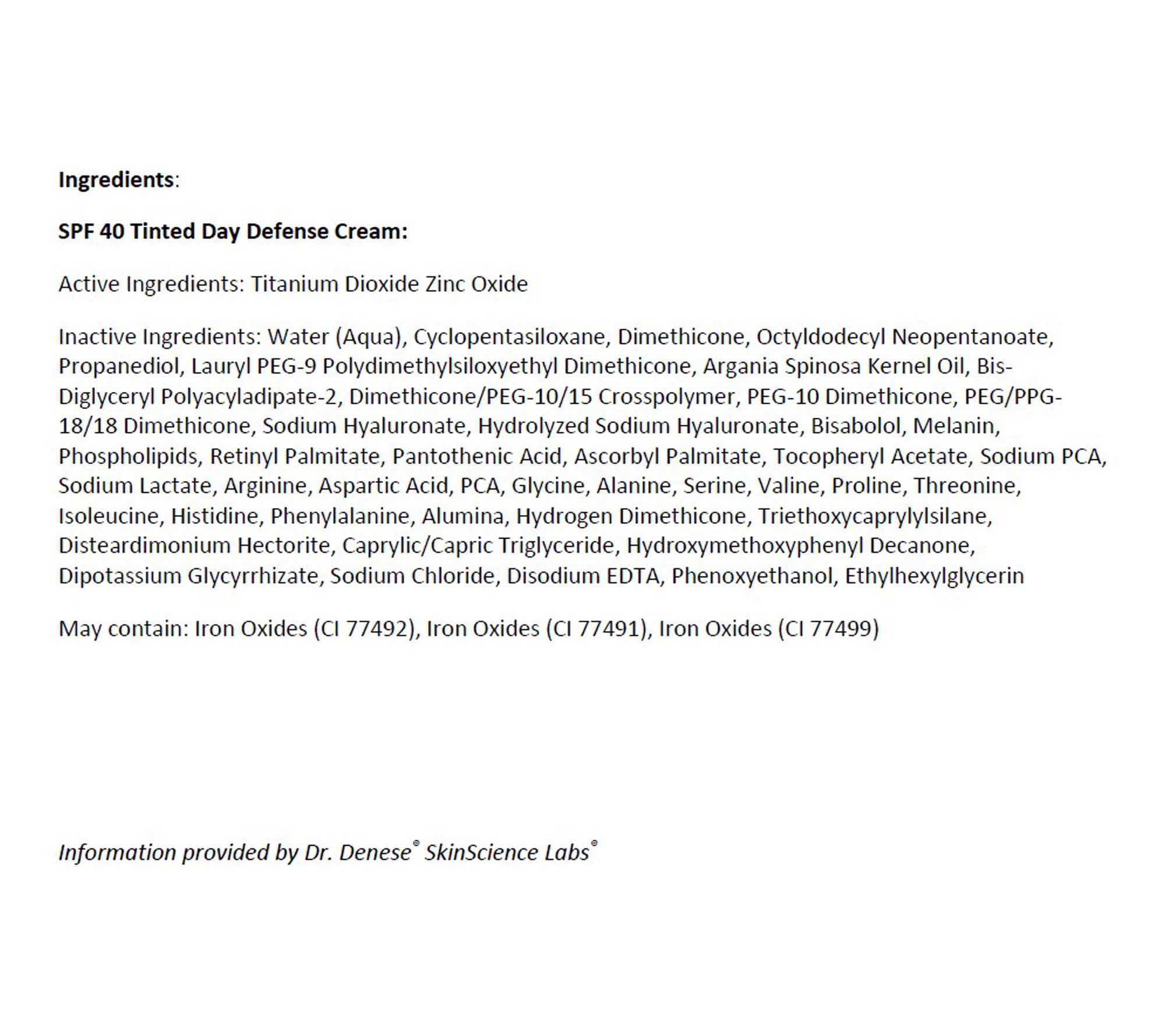 Dr. Denese Tinted Defense Day Cream SPF 40 delivers UVA/UVB Broad Spectrum SPF 40 protection to the face, eyes, hand, neck, and decollete. When used as directed with other sun protection measures, it helps decrease the risk of skin cancer and early skin aging caused by the sun. Formulated with hyaluronic acid, sodium PCA, bisabolol, vitamins A, B5, C and E, melanin, and 11 amino acids and tinted with pigments that delivers instant, natural-looking coverage to every skin tone, the cream provides sheer coverage so your complexion looks flawless, beautiful, and hydrated.
