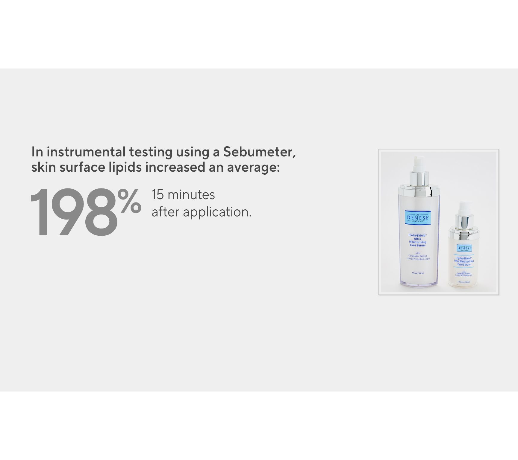In instrumental testing on 25 subjects using a sebumeter, there was a 198% average increase in skin surface lipids 15 minutes after application, and 100% of the participants experienced an improvement.