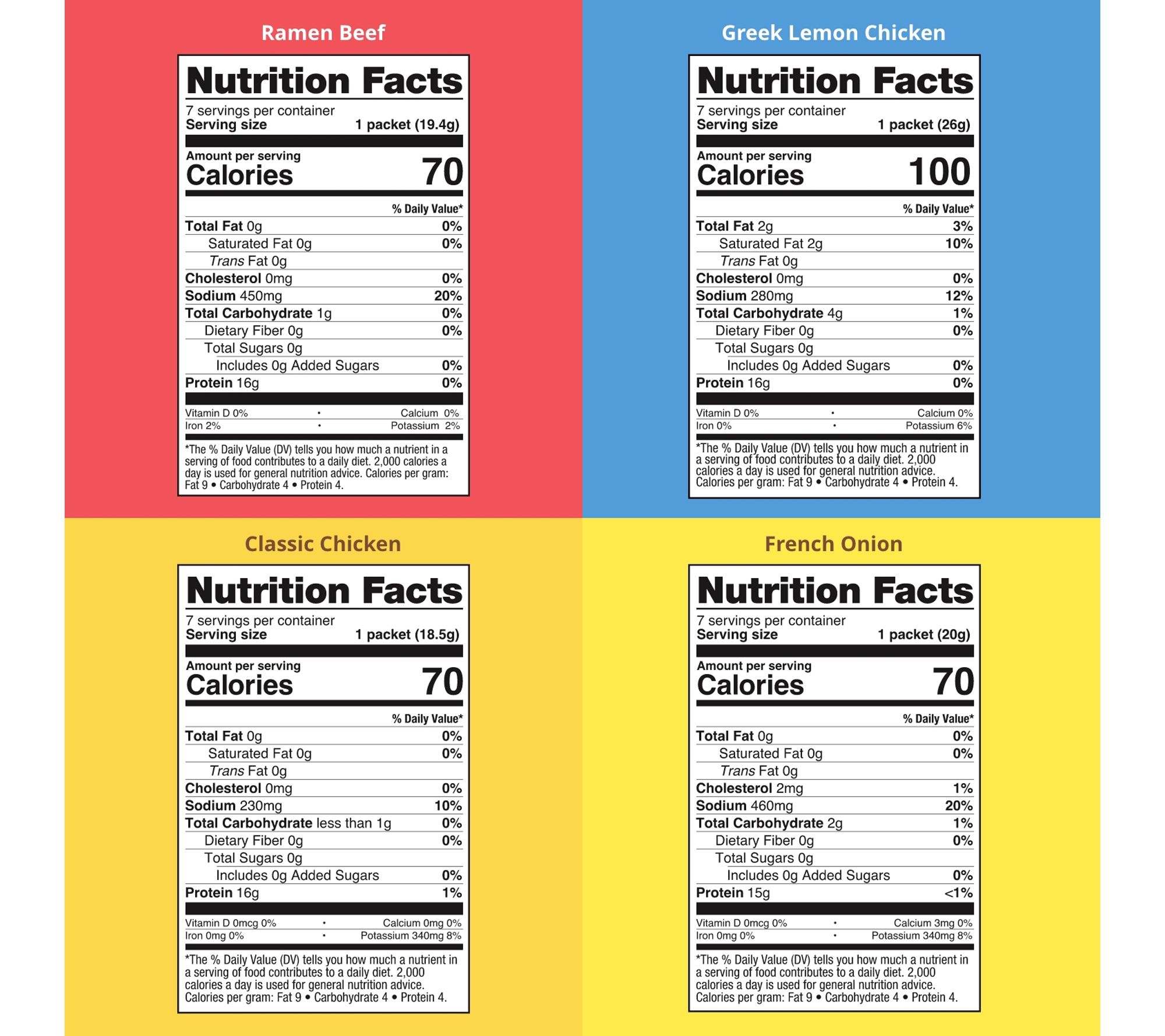 • Includes 28 bone broth packets: seven packets each of Ramen Beef, Greek Lemon Chicken, Classic Chicken, and French Onion