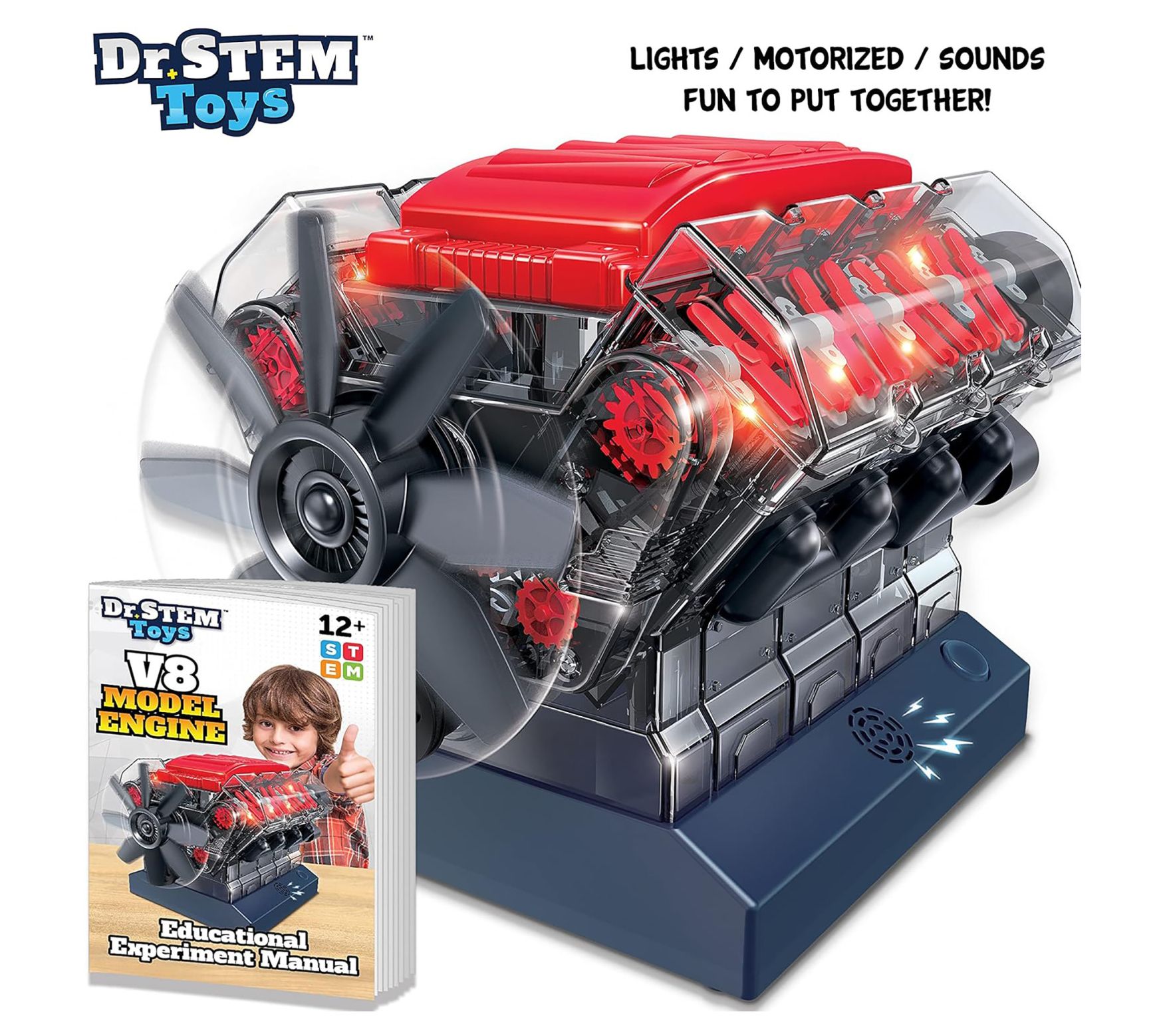 Bring the excitement of automotive engineering into your home with this V8 model engine building kit. With 271 pieces and an easy-to-follow workbook, this interactive set lets teens and adults assemble their own working engine, complete with dynamic lighting and realistic sound effects that mimic a roaring V8. A hands-on project for learning and fun, it's a great gift for aspiring engineers and mechanics. From Dr. STEM Toys.