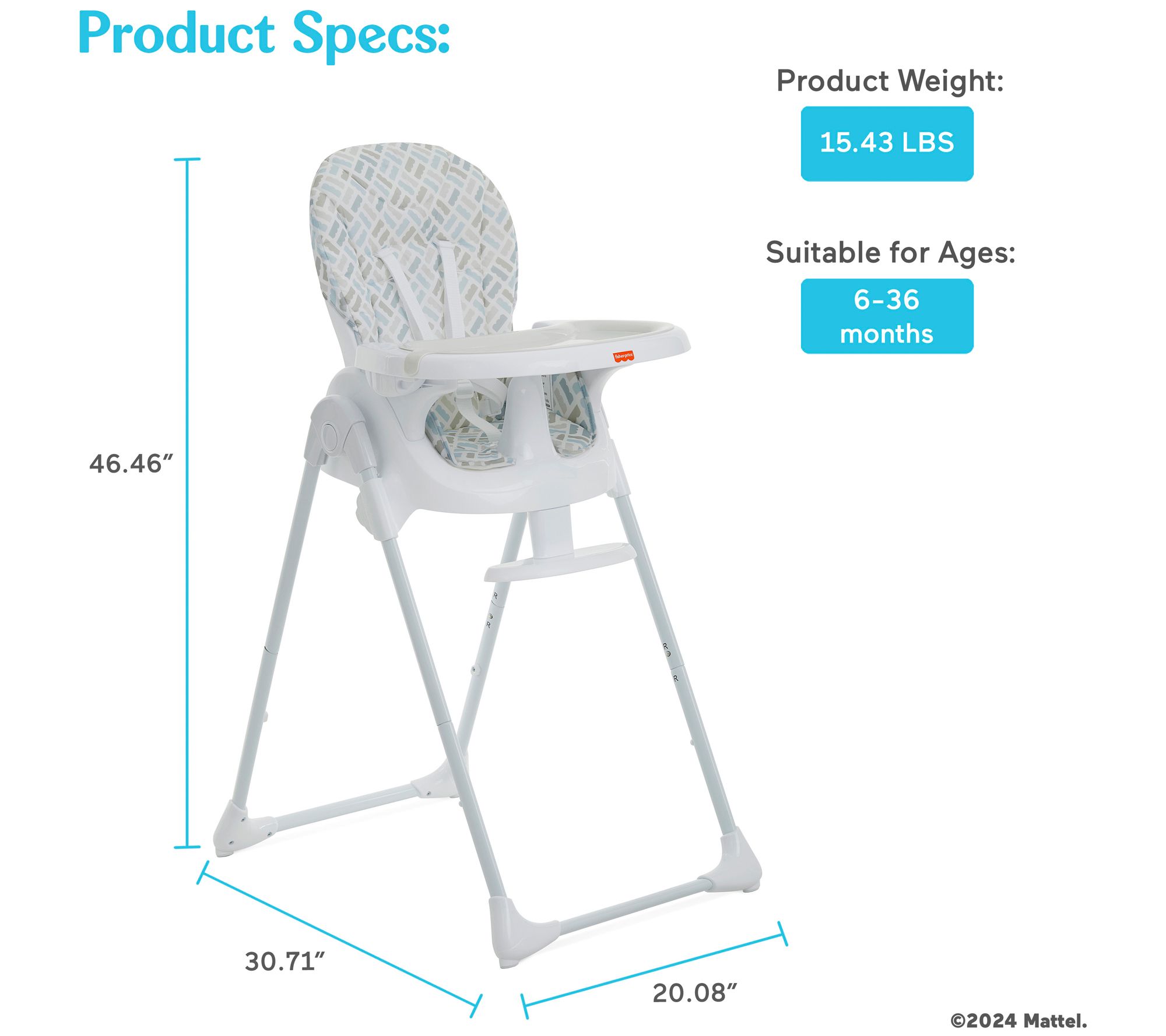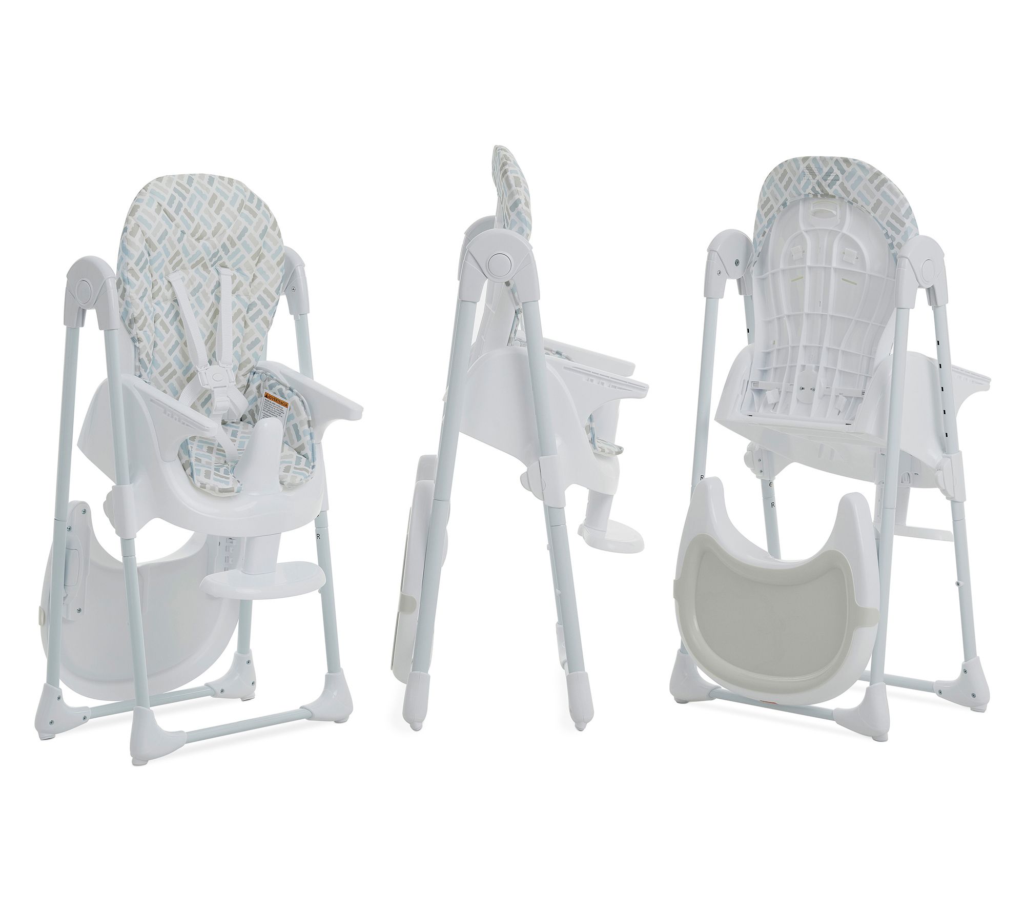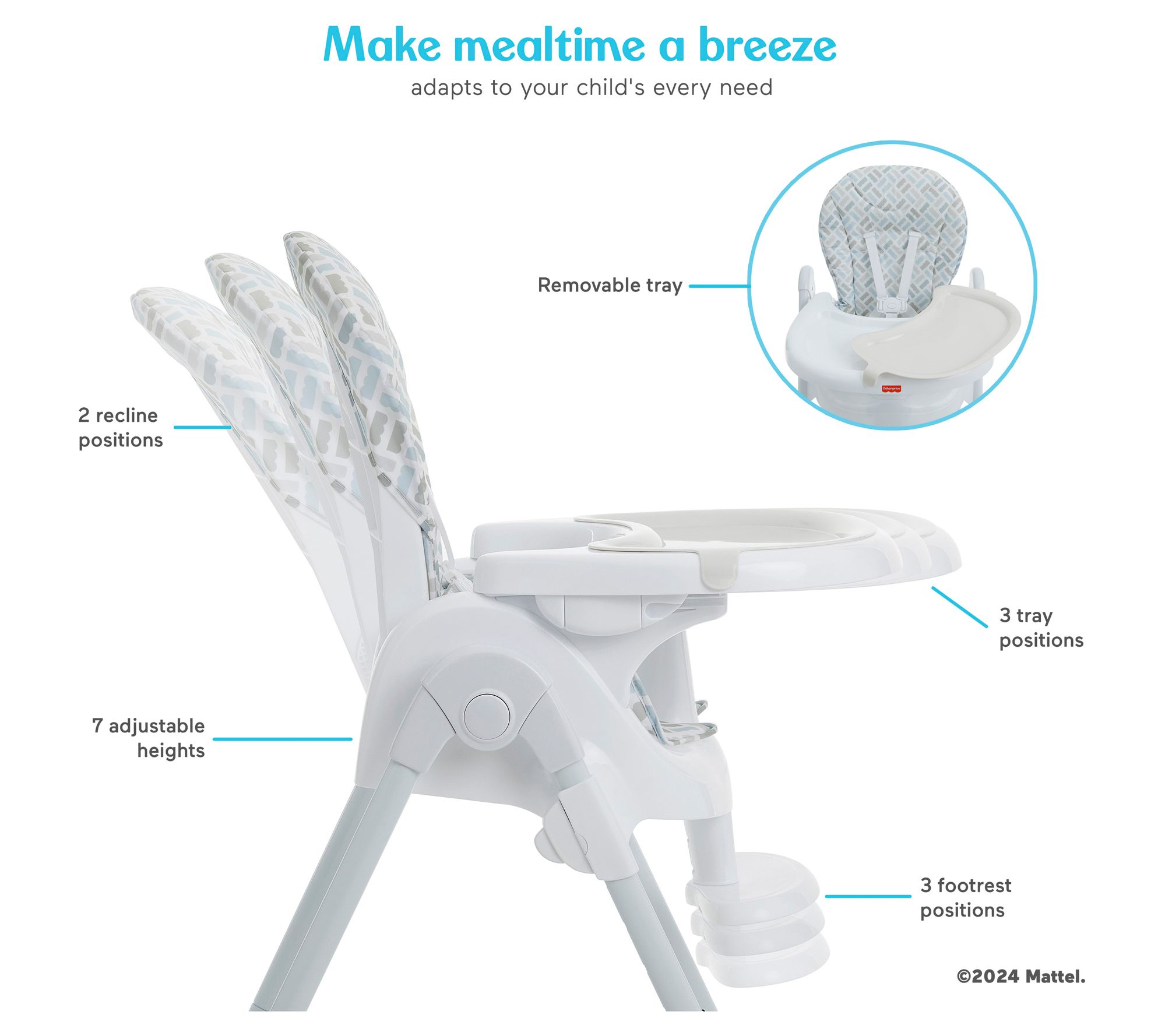 Meal and playtime just got easier with this high chair. With seven adjustable height positions, three tray positions, and two backrest positions, this chair grows with your child, adapting to their changing needs. The easy-to-clean dual tray allows for seamless transitions between eating and playing. From Dream On Me.