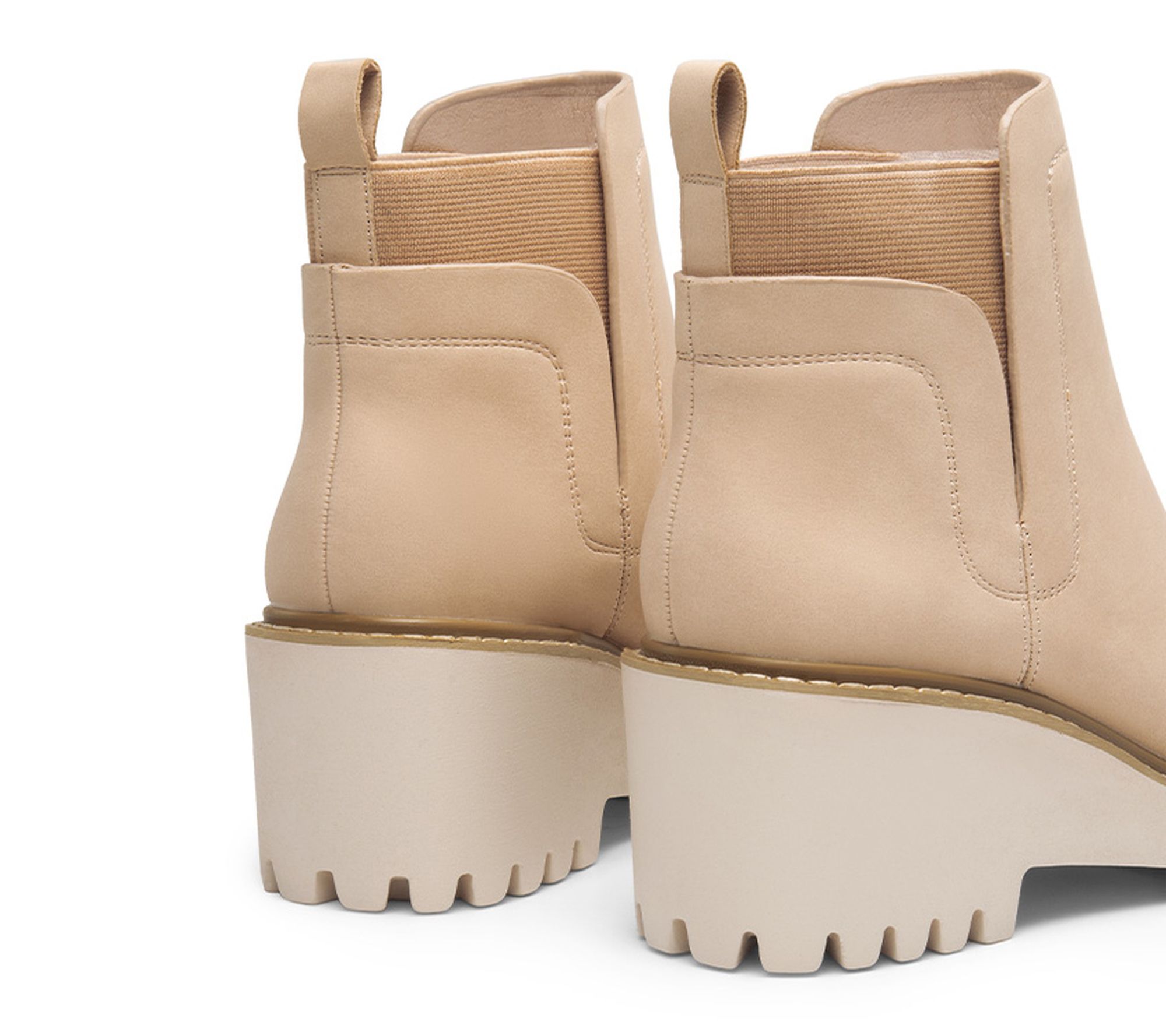 Lug outsole; pull-on design; Chelsea boot style; elastic goring at sides; round toe