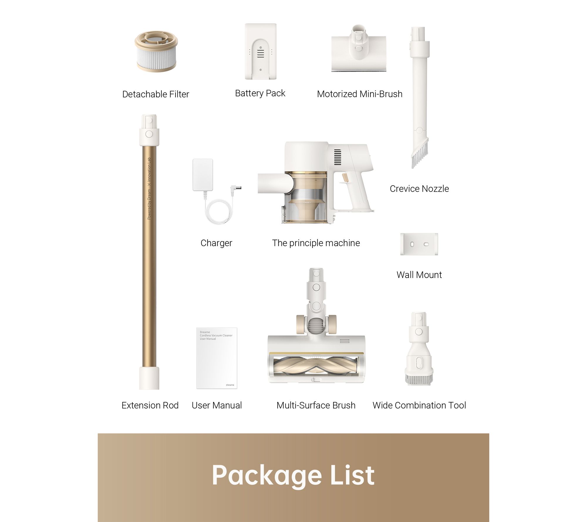 Includes extension rod, motorized mini brush, crevice nozzle, wide combination tool, multi-surface brush, wall mount, charger, and user manual