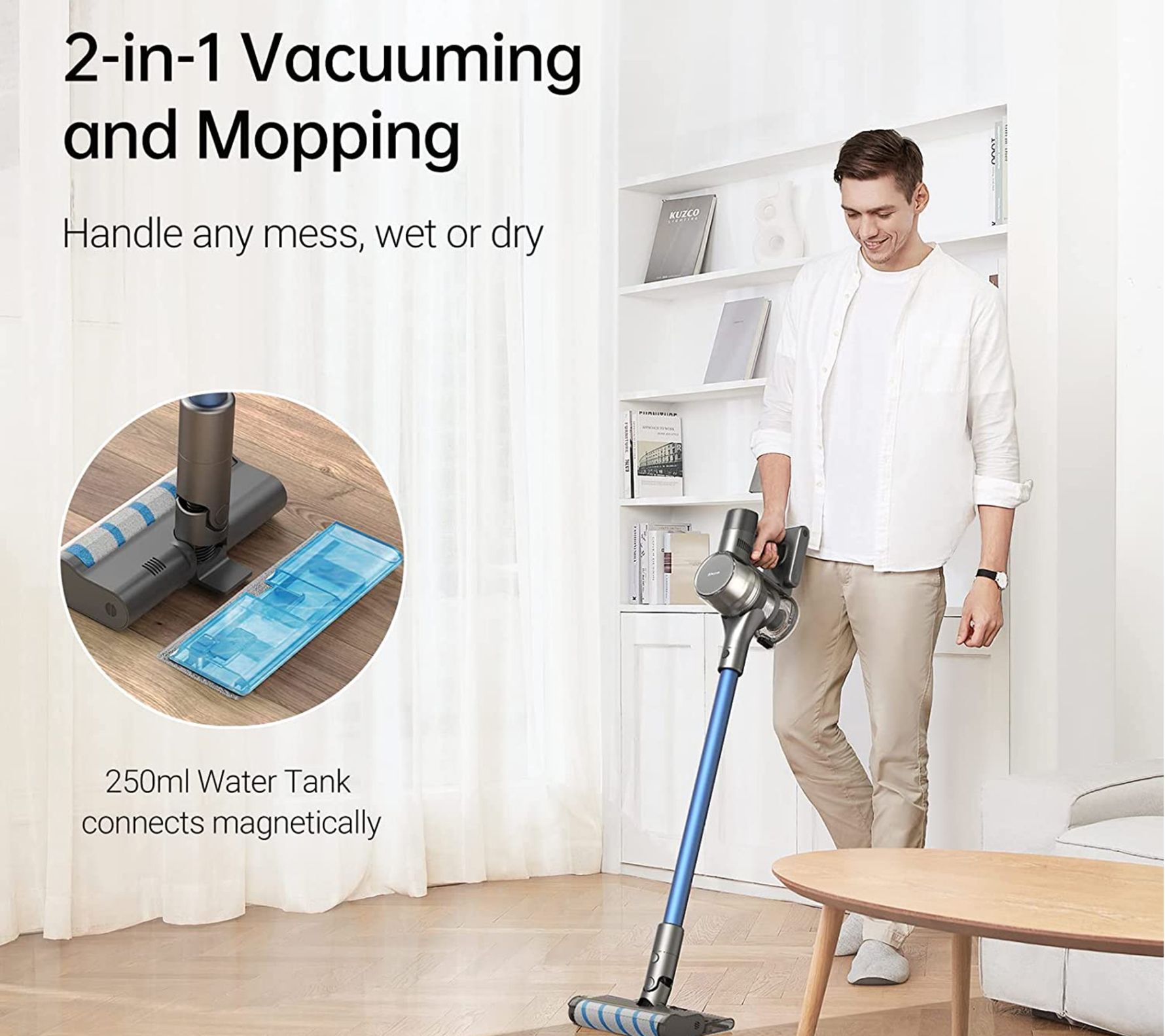 • Includes T20PRO cordless vacuum cleaner, 250-ml water tank and mop, two batteries, battery adapter, two-in-one wall-mounted charging dock, two-in-one brush, V-shape brush, crevice nozzle, mini motorized brush, and soft roller brush nozzle
