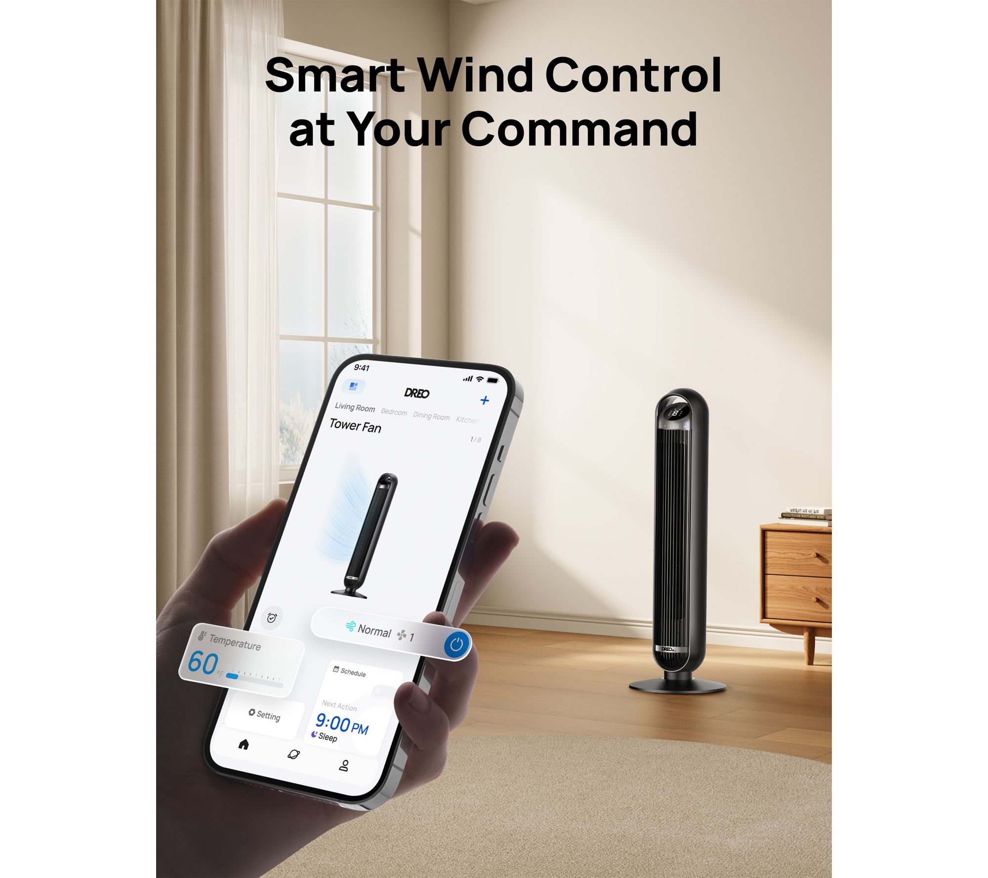Feel a refreshing breeze throughout your living space with this smart tower fan -- quiet enough for restful nights, yet powerful enough to help you beat the heat on the warmest days. Manage airflow right from your smartphone, or use the remote to customize speed and mode from the comfort of your sofa. From Dreo.