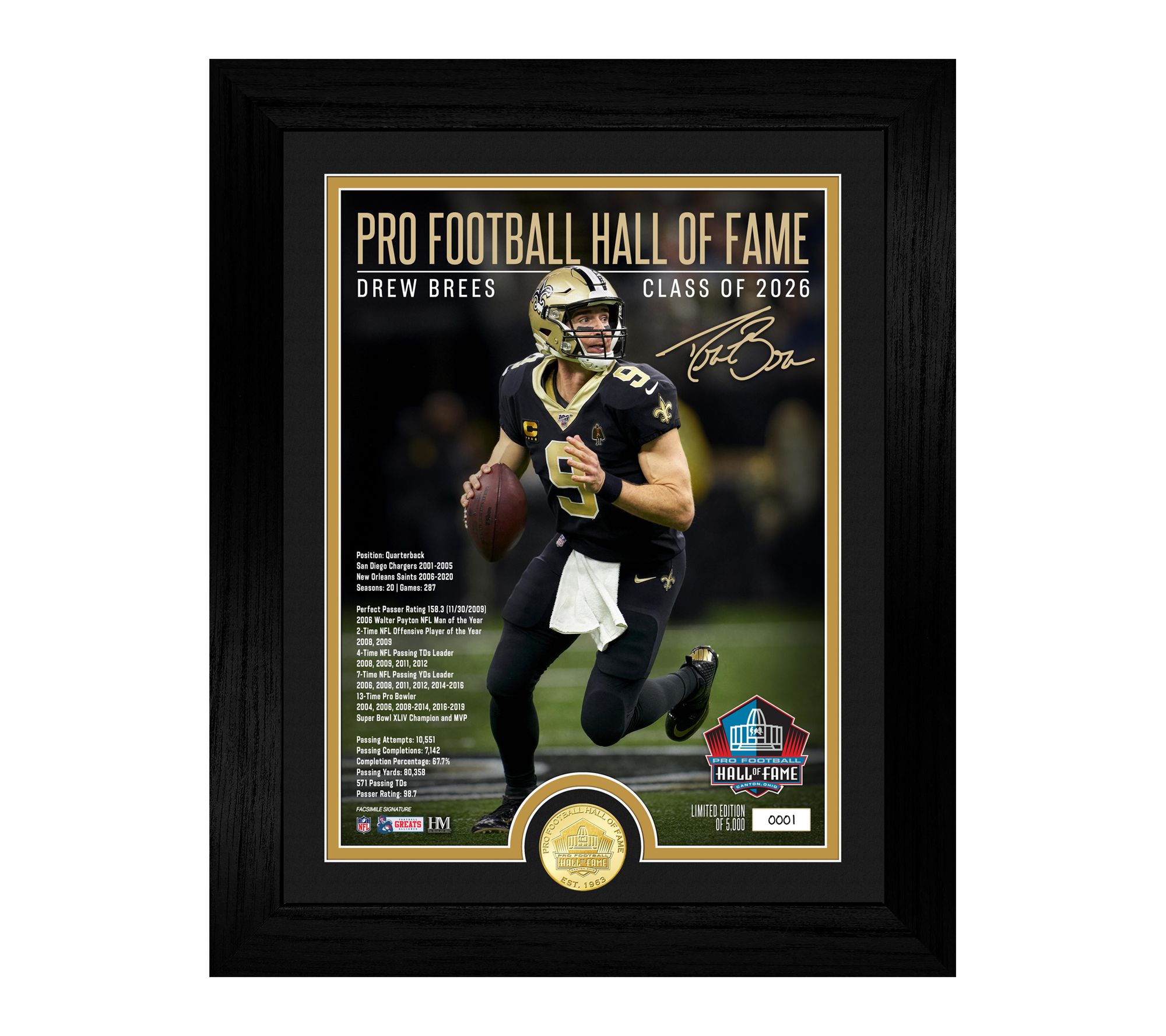 Honor a legendary gridiron journey with this frame, celebrating Drew Brees' induction into the Pro Football Hall of Fame as part of the Class of 2026. Highlighted by a custom-designed action print with exclusive career stats, each collectible features an individually numbered display and a Hall of Fame minted bronze coin, beautifully set behind acrylic glass for years of enjoyment. From The Highland Mint.