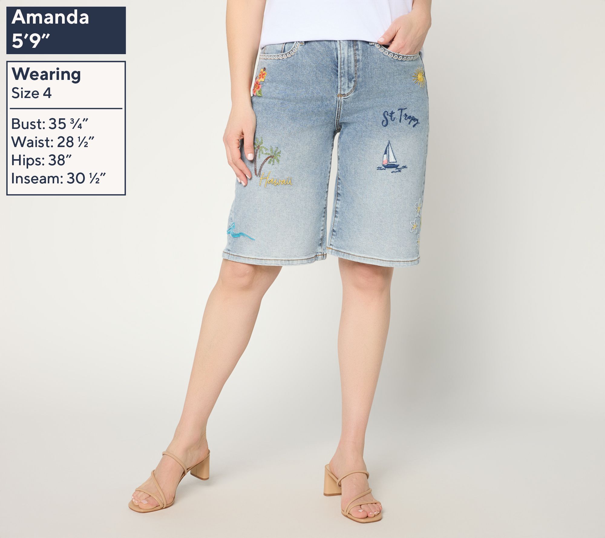 Features: embroidered design, five pockets, zipper fly, knee length