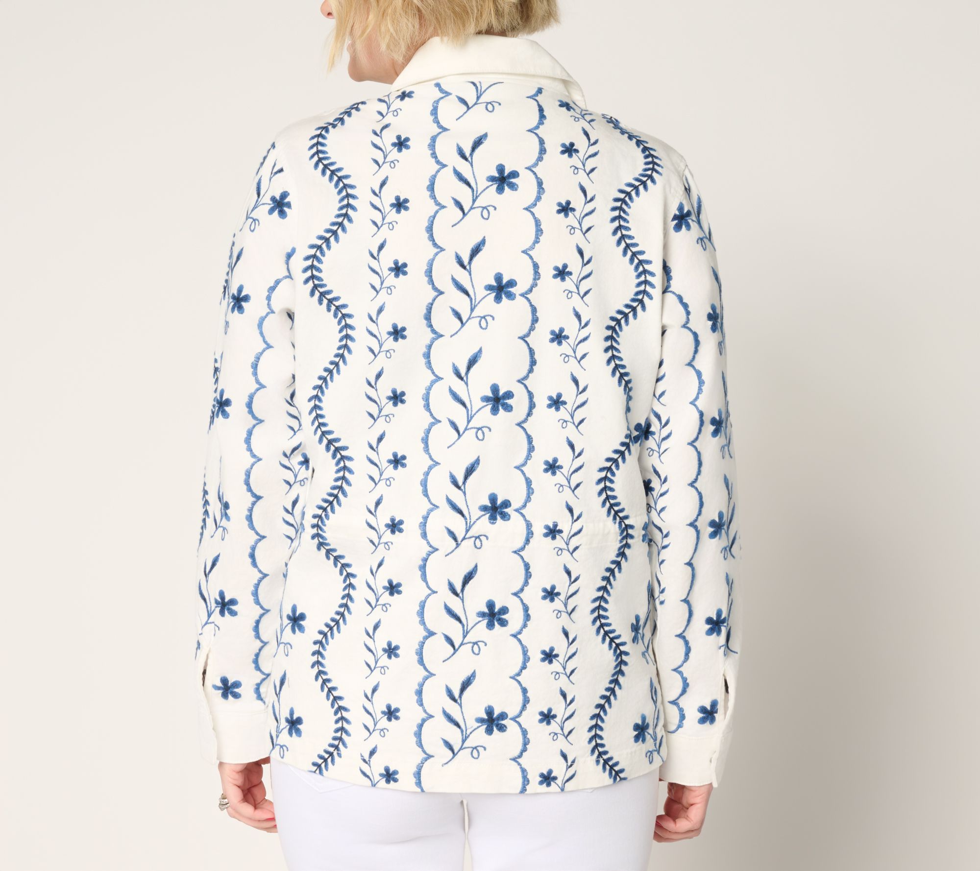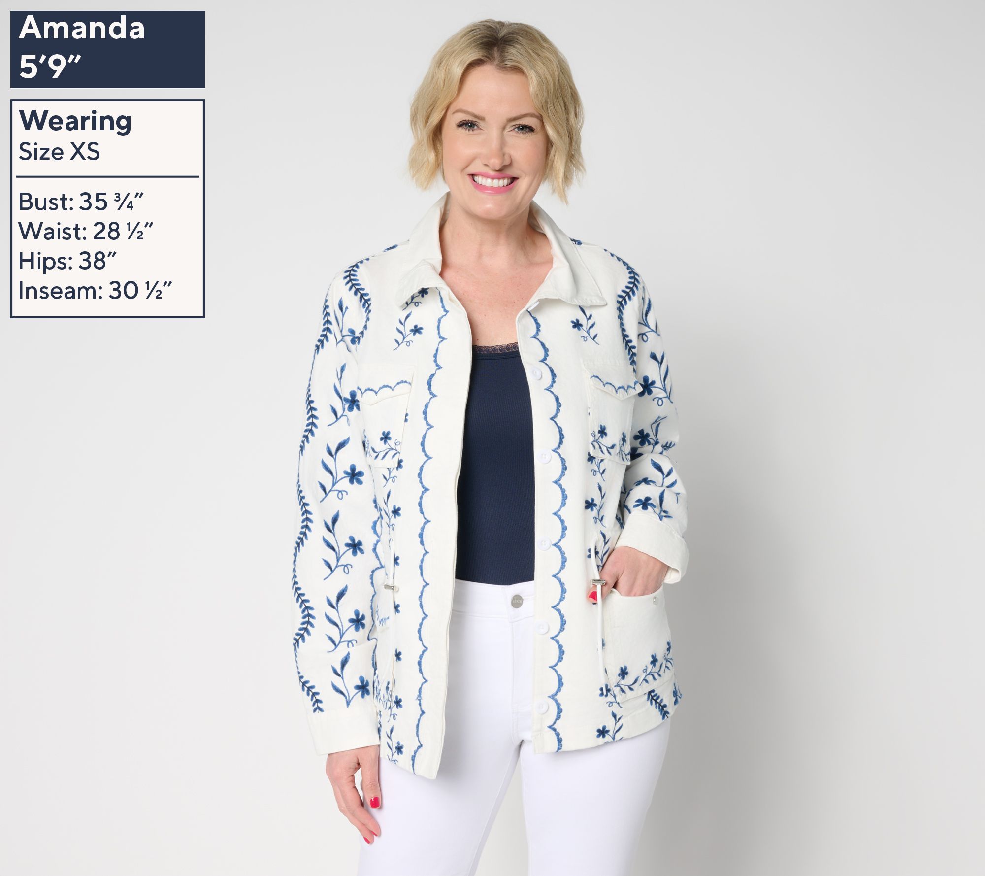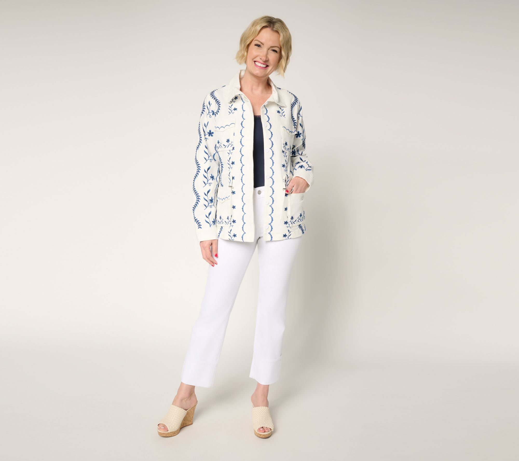 Heading out for errands or to a Sunday brunch, this Amber utility jacket brings along cotton-rich comfort and summer's favorite lightweight fabric -- linen. But it's the boutique-chic embroidered design that'll be the envy of all. From Driftwood Jeans.
