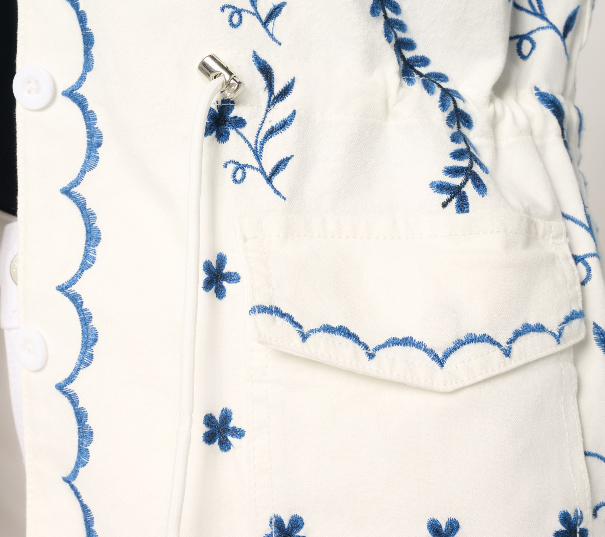 • Features: embroidered design, adjustable waist drawcord, button closure with hidden placket, chest pockets, two waist patch pockets