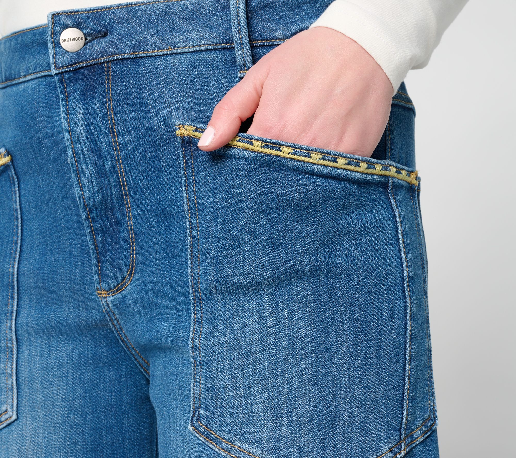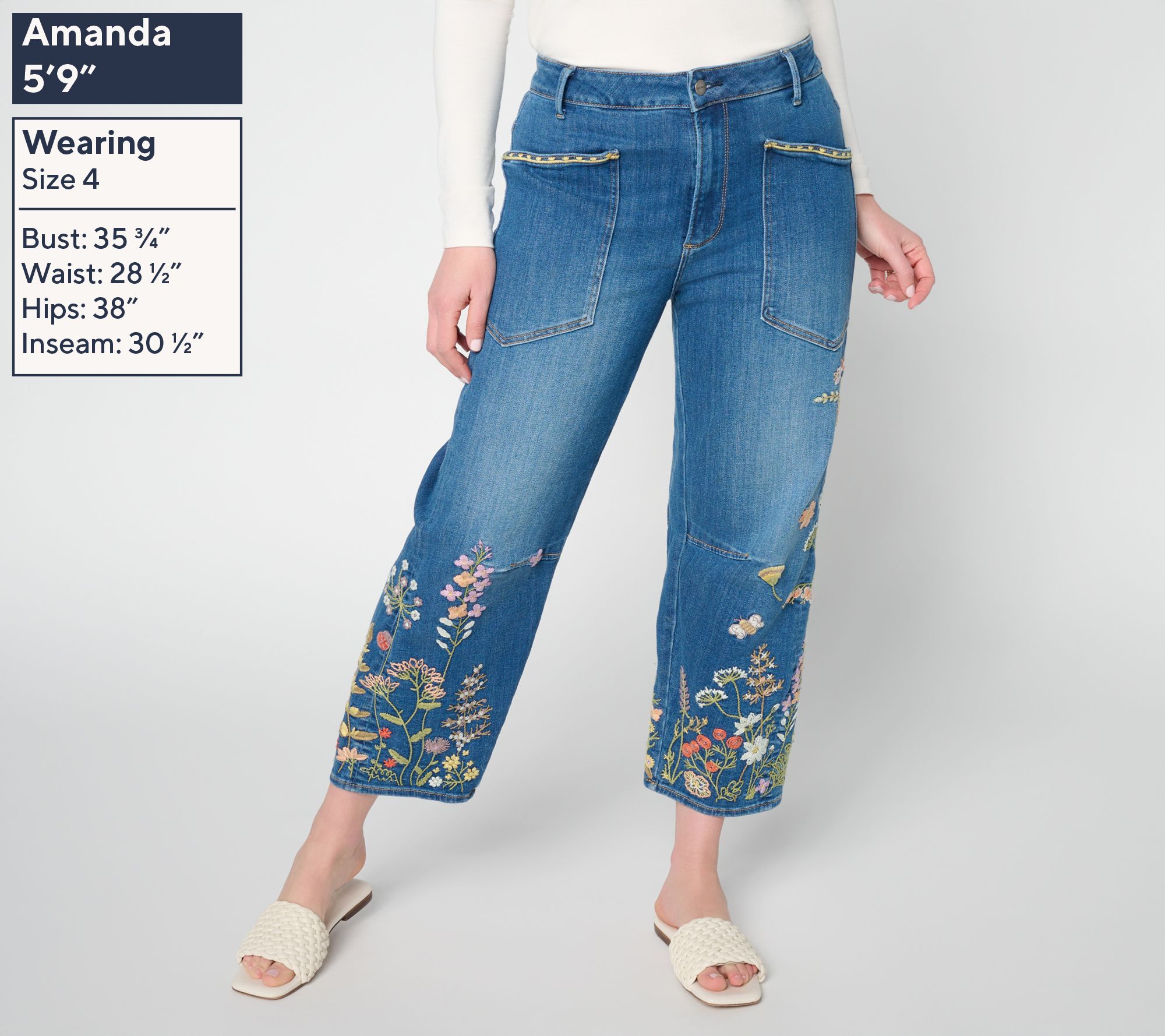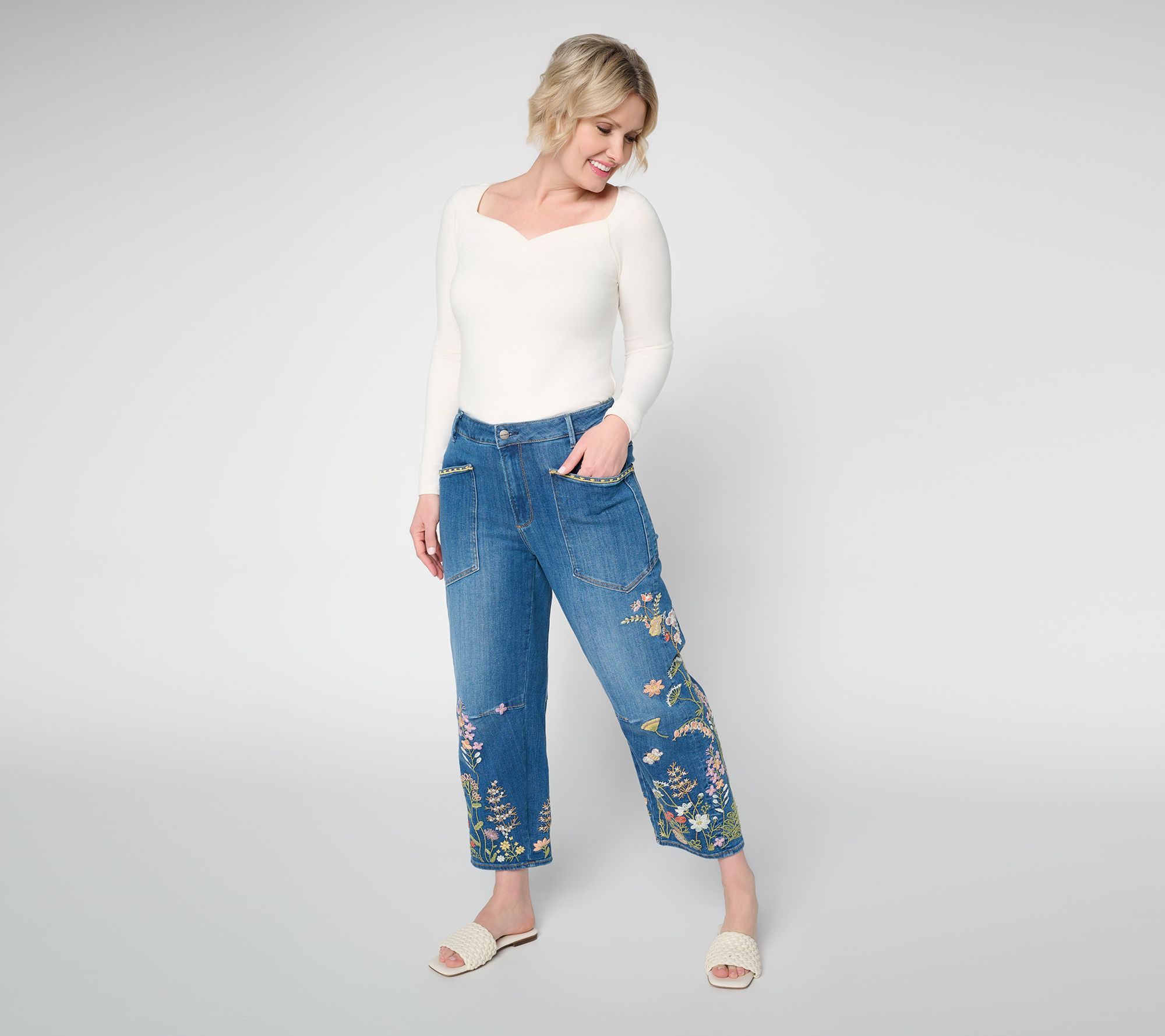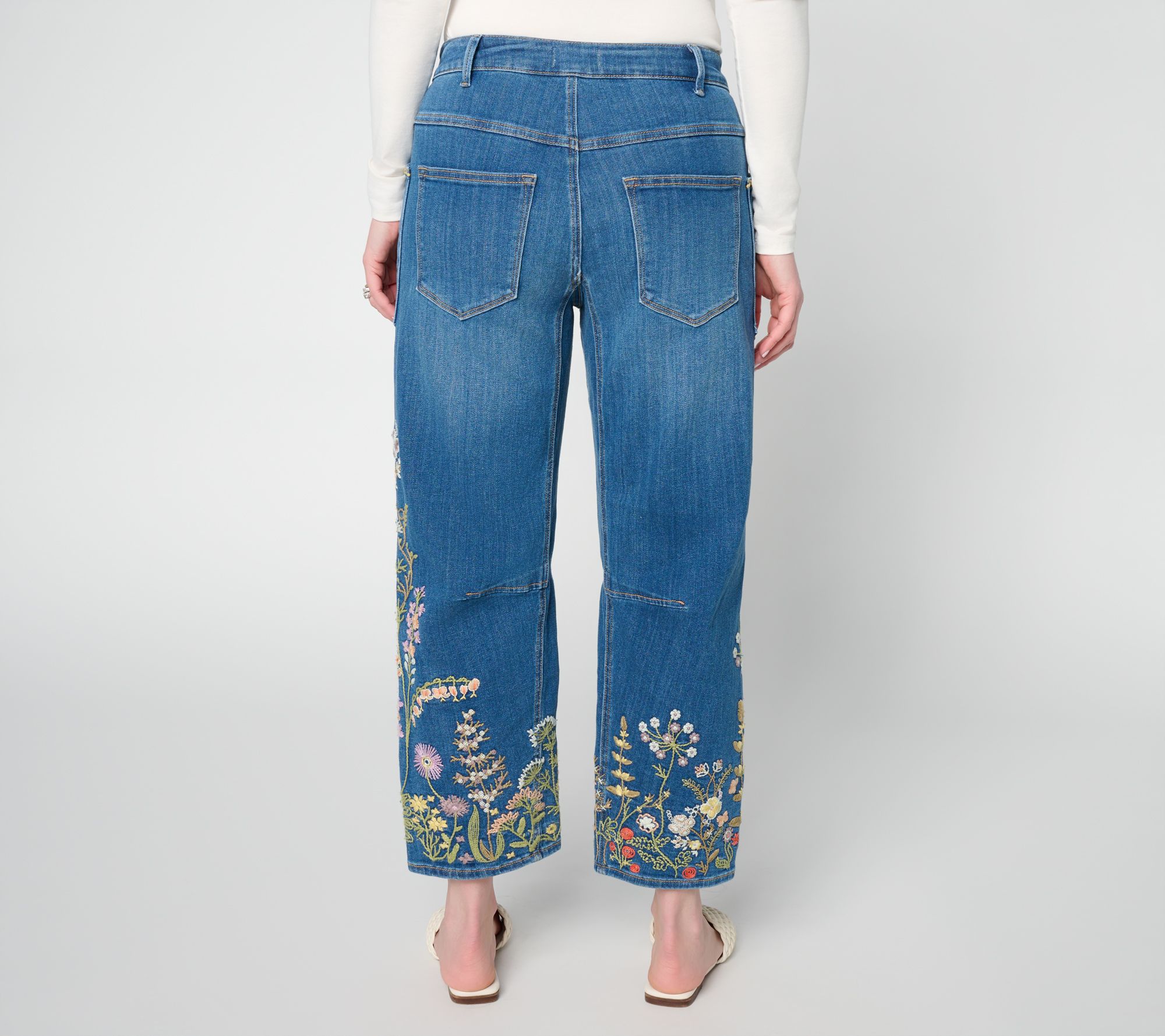 Add a pop of playful detail to everyday style with these embroidered barrel-leg jeans, designed for relaxed comfort during afternoon outings or creative workdays. Utility-style patch pockets bring a nod to classic denim, while the artistic floral touches make every moment a bit more vibrant. From Driftwood Jeans.
