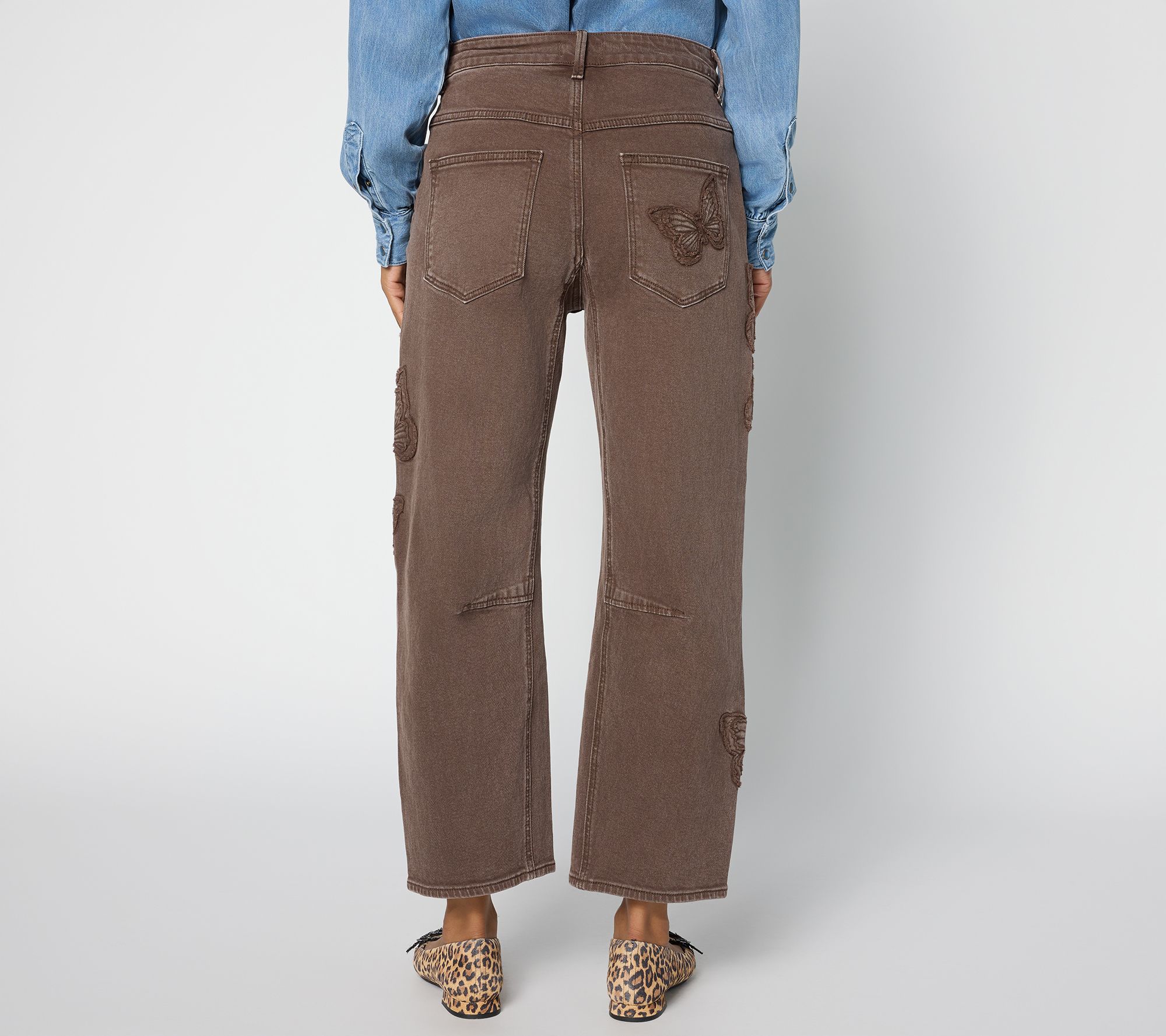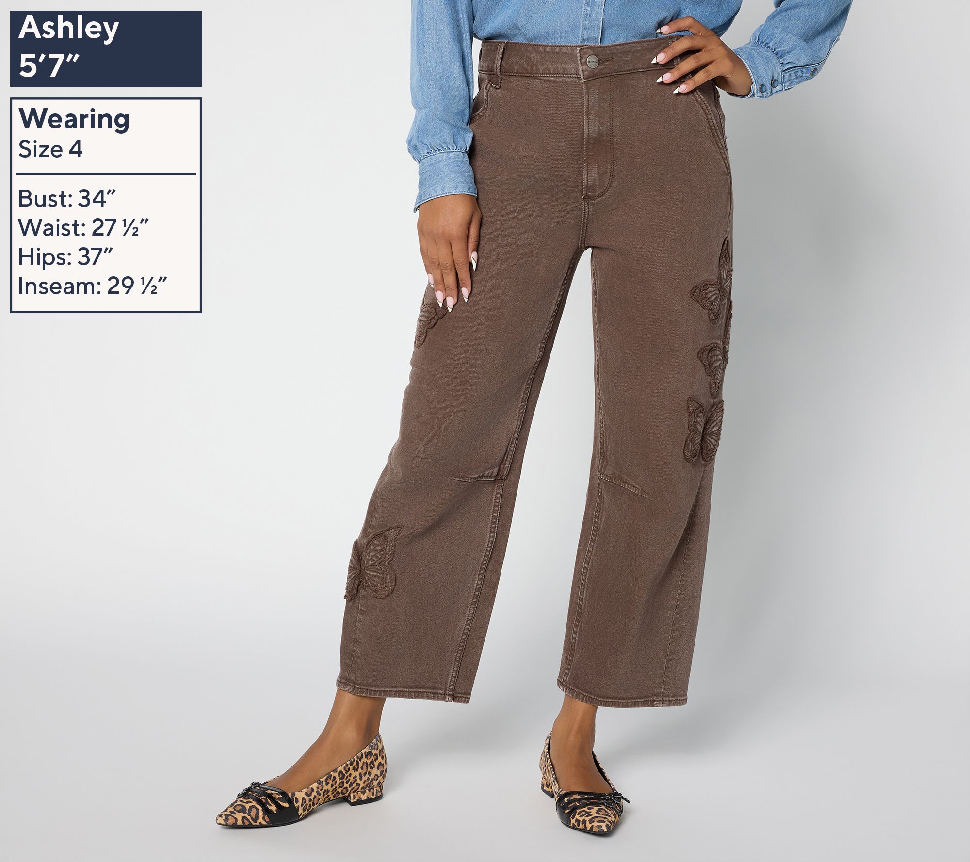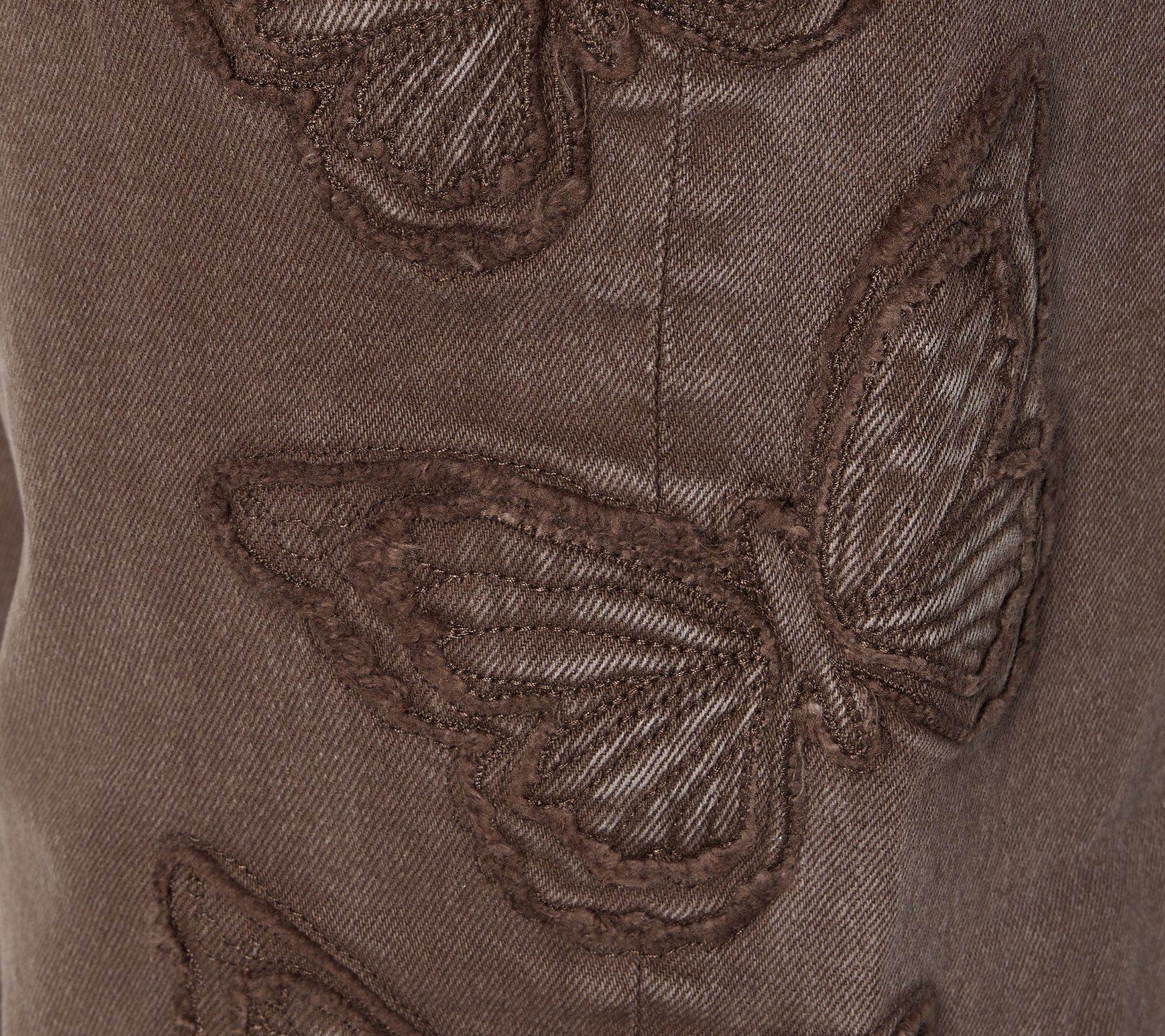 Features: embroidery patchwork butterflies on legs and back pocket, belt loops, dart at knee inseam, ankle length