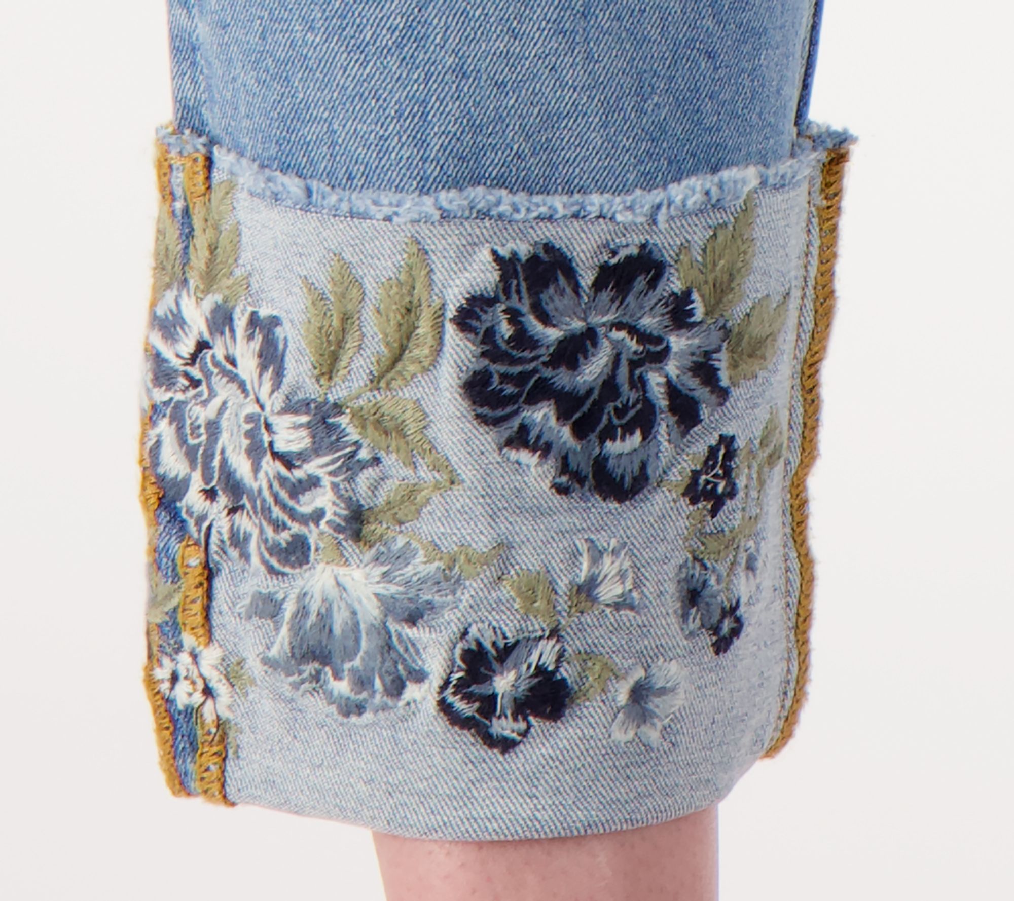 - Features: embroidered design, cuffs, crop length