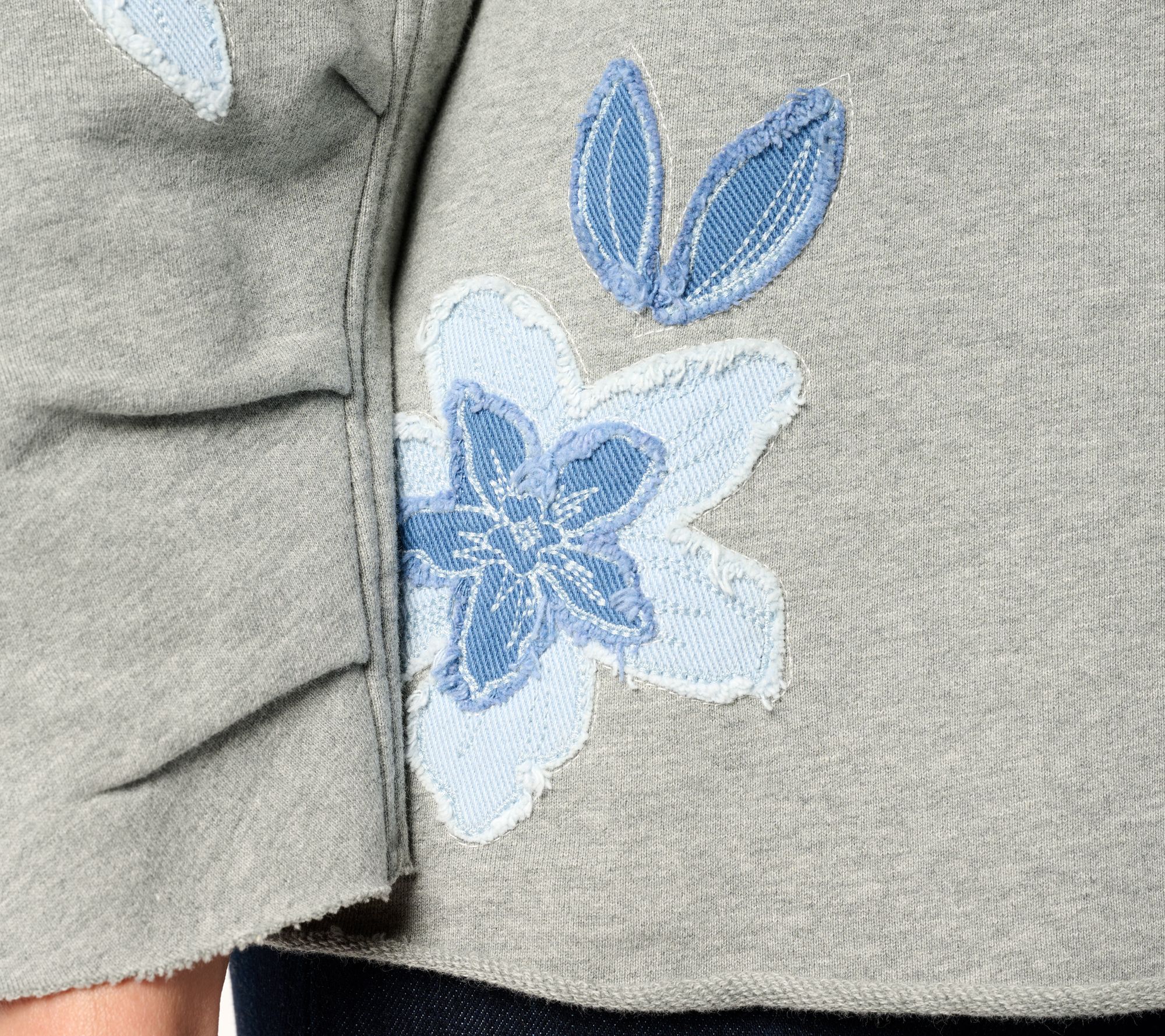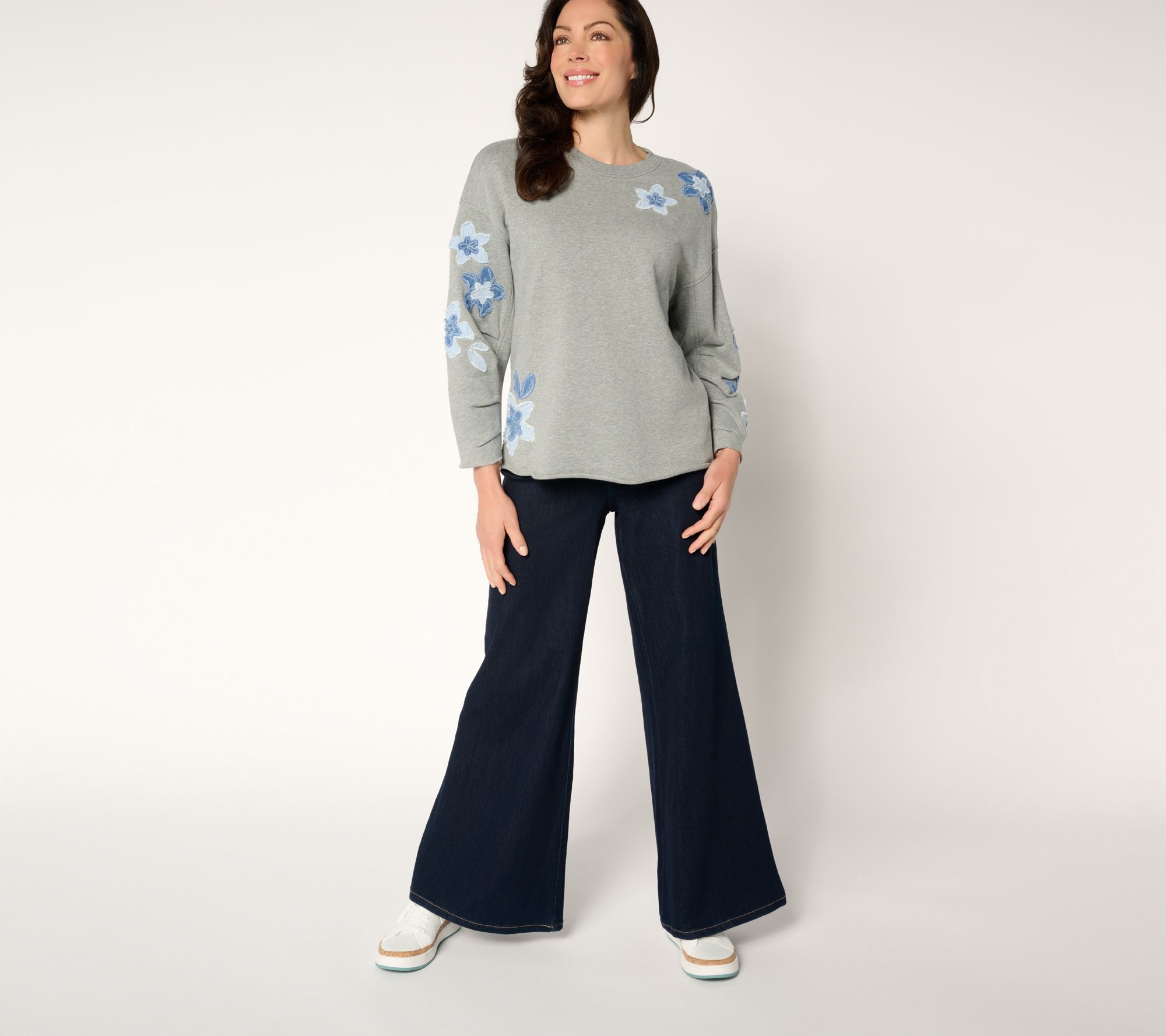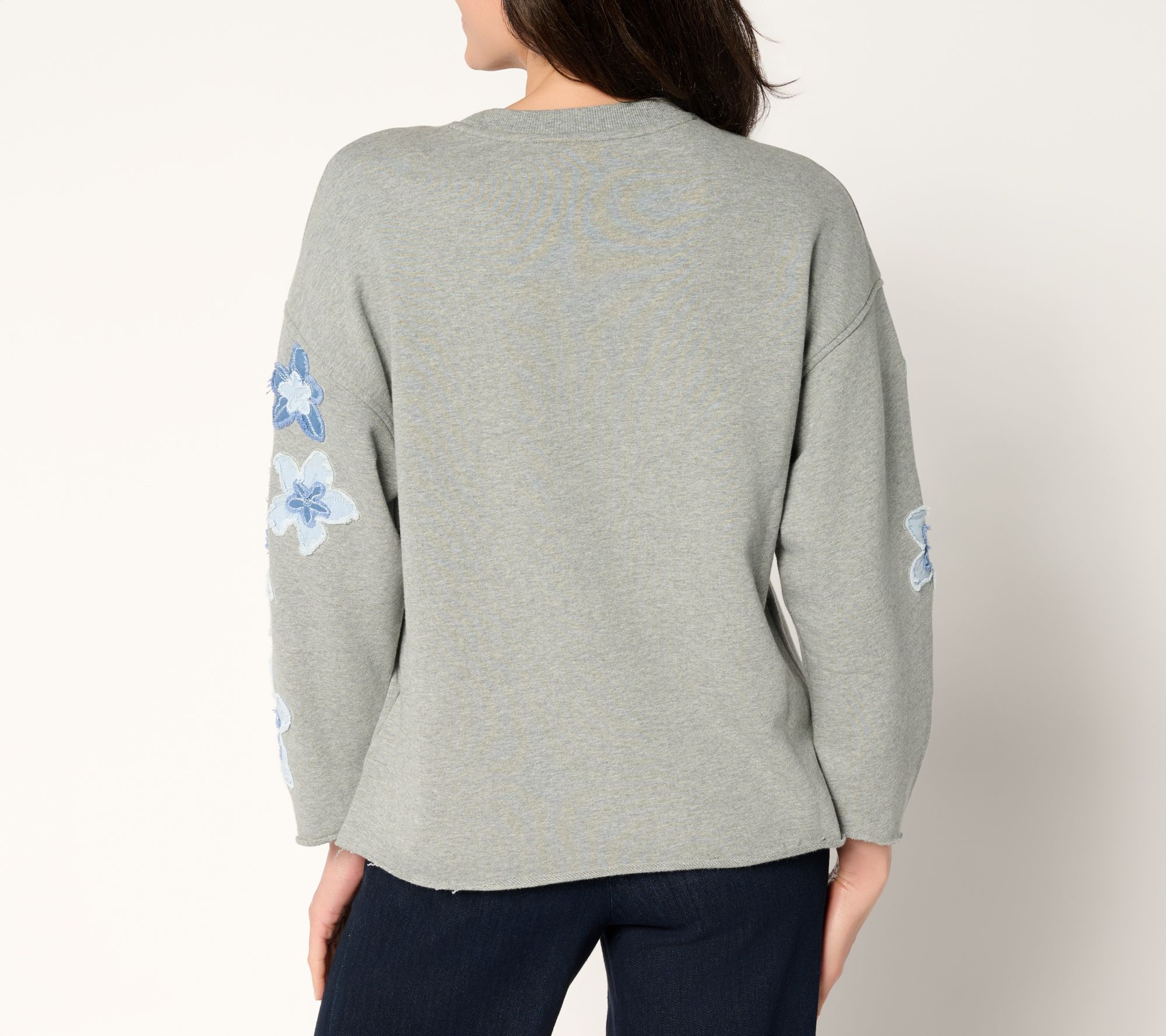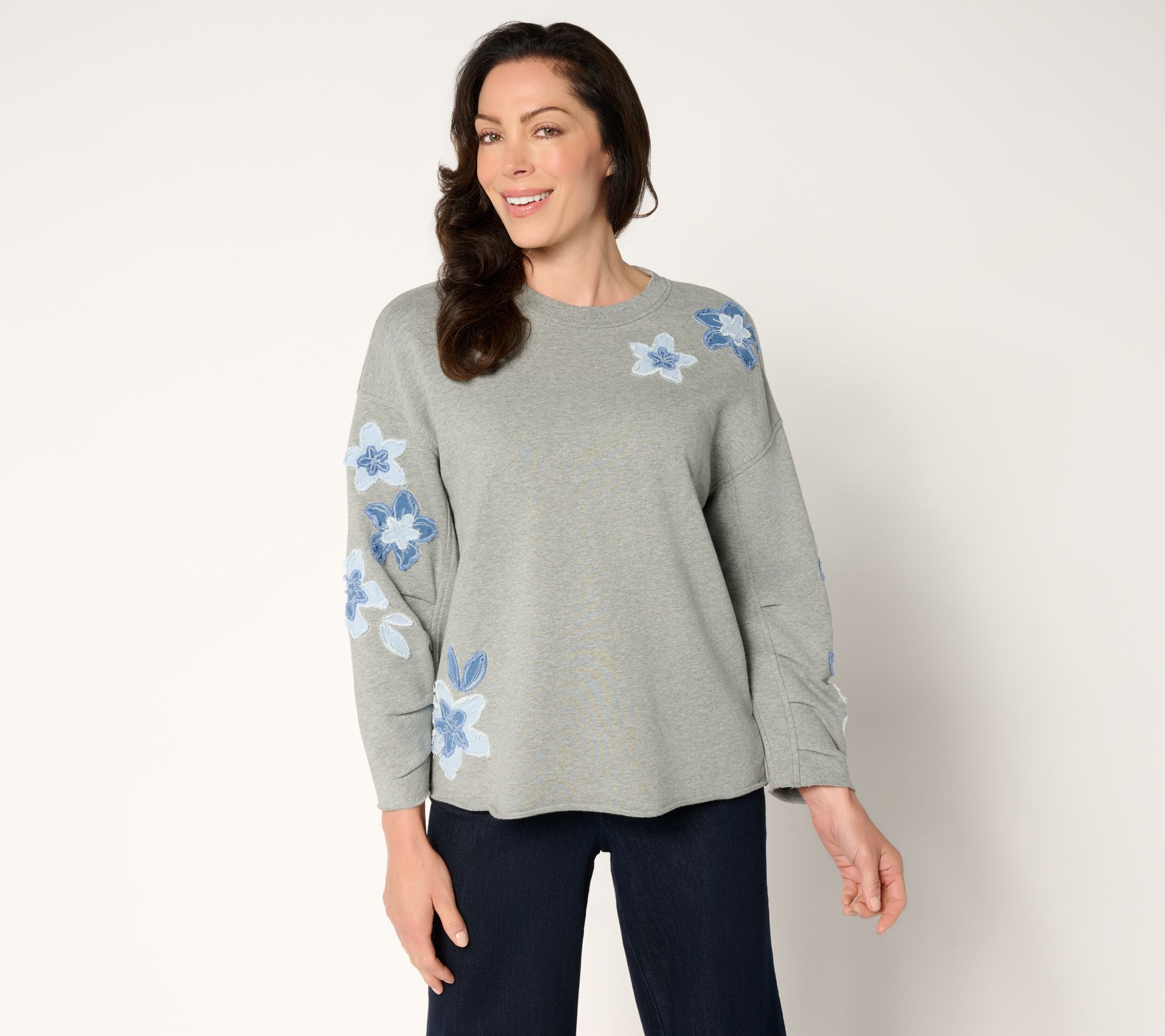 Switch up your weekend look with a top that provides personality! The intricate all-over embroidery and relaxed, drop-shoulder silhouette add an effortless sense of style, while gathered French terry sleeves create soft volume that's comfy all day. Try it with joggers or skinny jeans for easy-going plans or lazy days at home. From Driftwood Jeans.