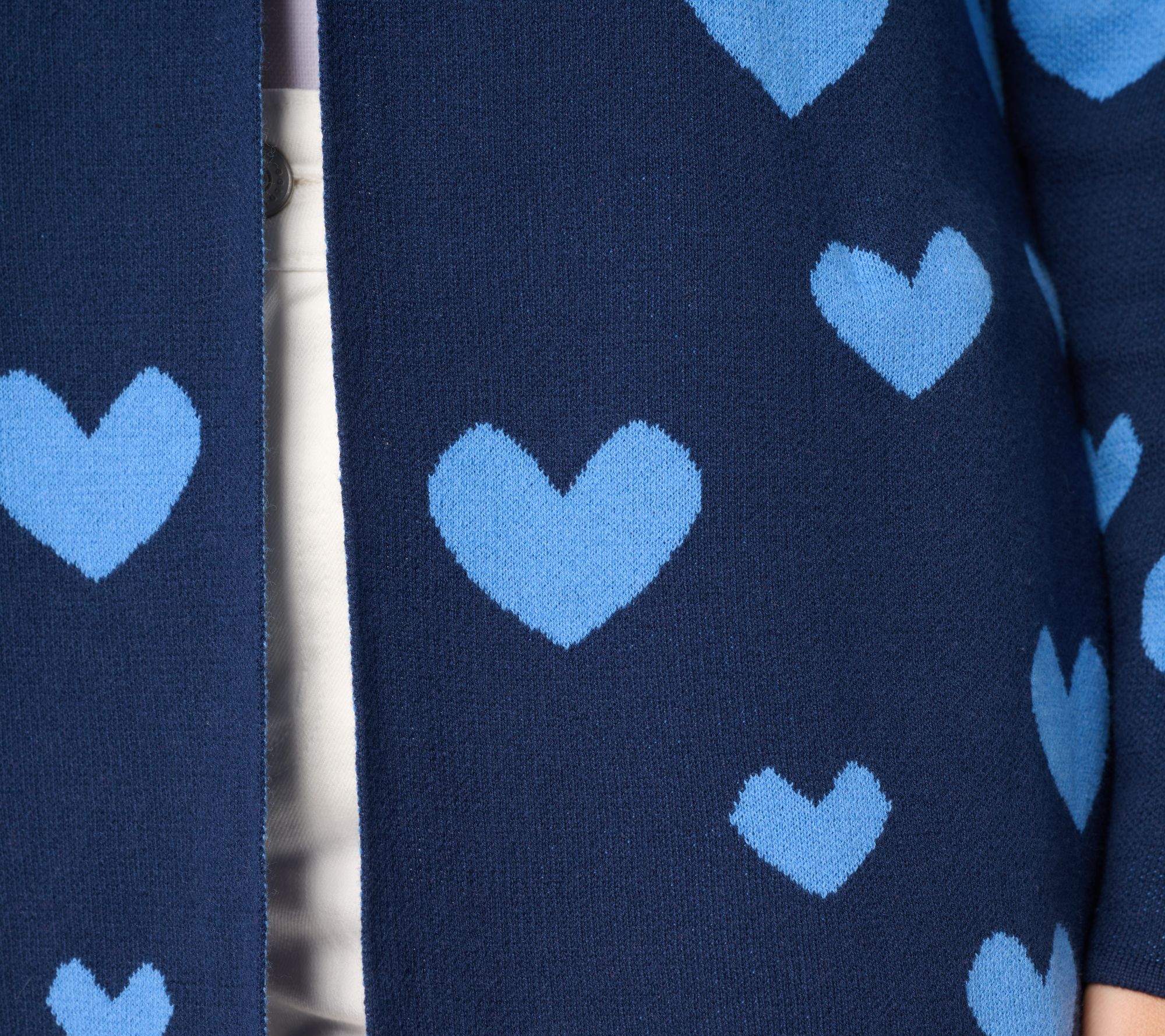Features: long sleeves, patterned knit details, pockets, navy heart motif