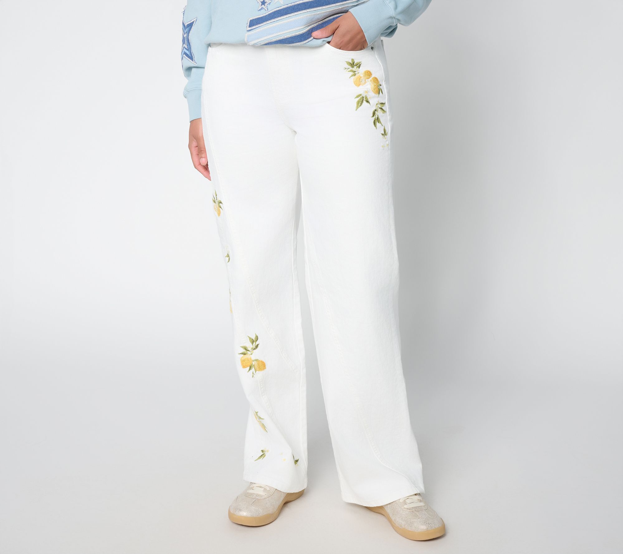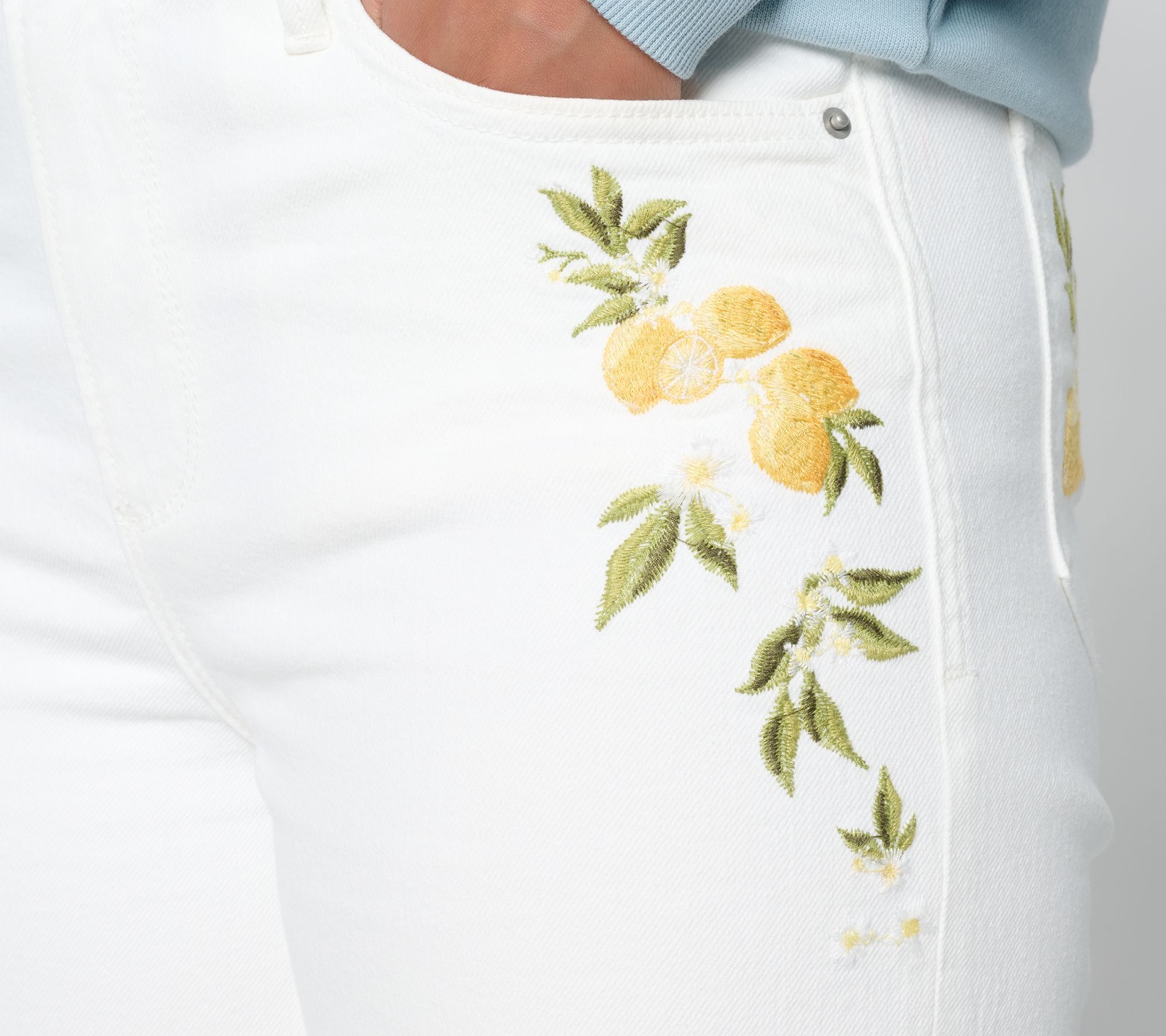 Jazz up your jean routine! Freshly picked just for you, these cotton-rich jeans, embroidered with sunny-yellow lemons, add a zesty twist to your denim rotation. Whether you're headed out for brunch with friends or relaxing on a sunny afternoon, they'll bring citrusy style and cotton-rich comfort to every occasion. From Driftwood Jeans.