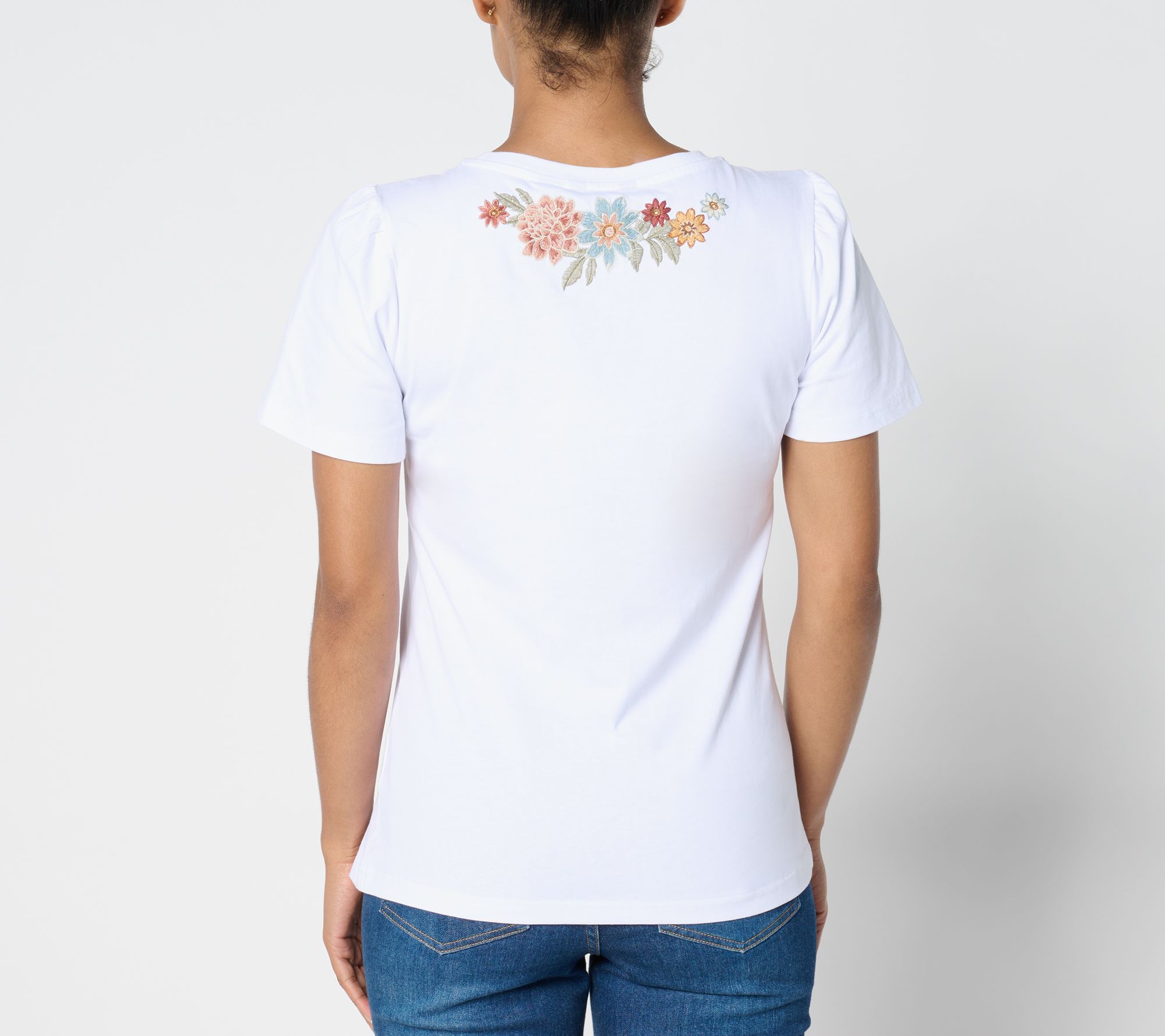 Features: embroidered design, small gathers at shoulder cap, set-in sleeves