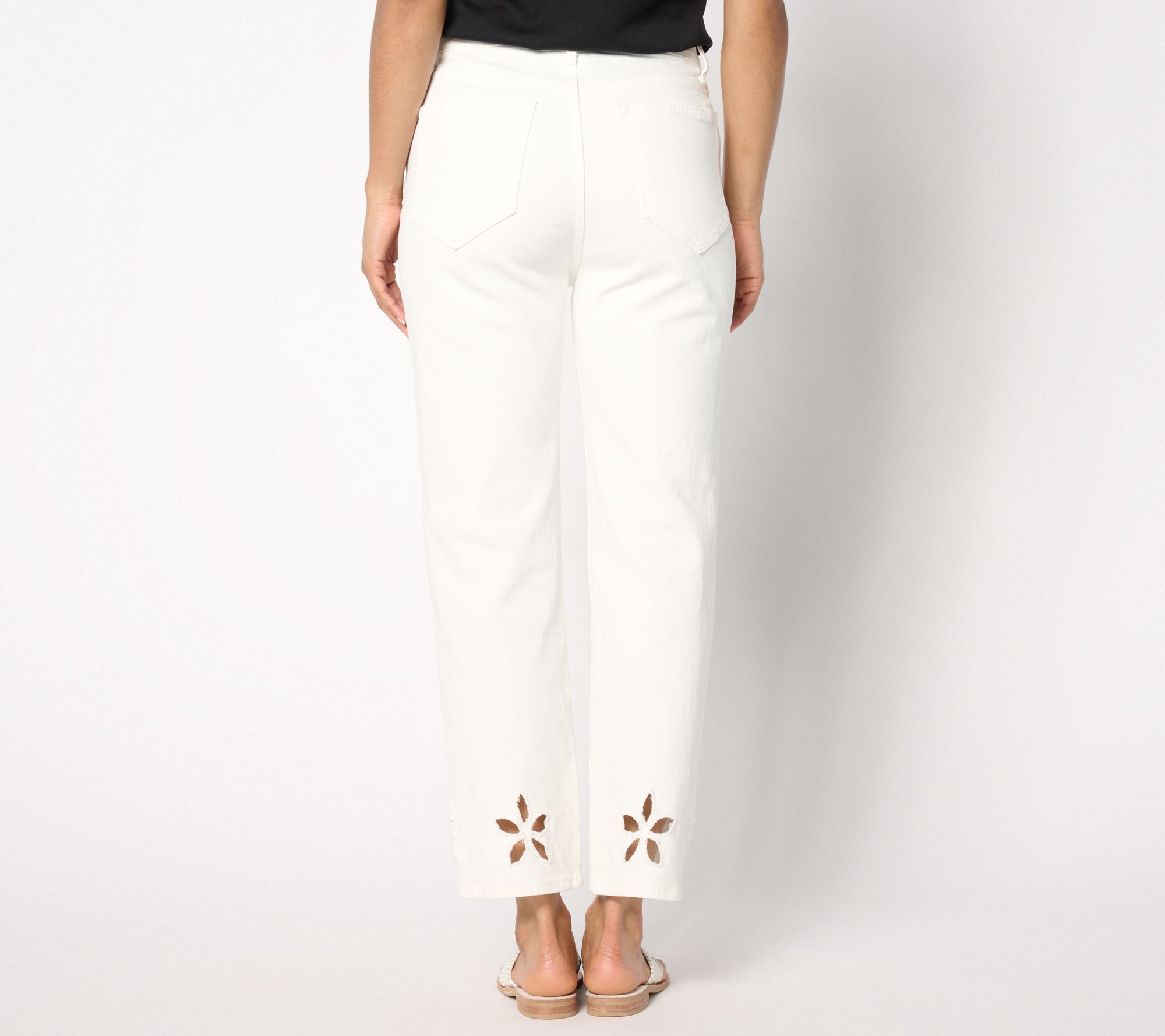Features: five-pocket styling, cutout design at leg bottom opening, raw edge hem, ankle length