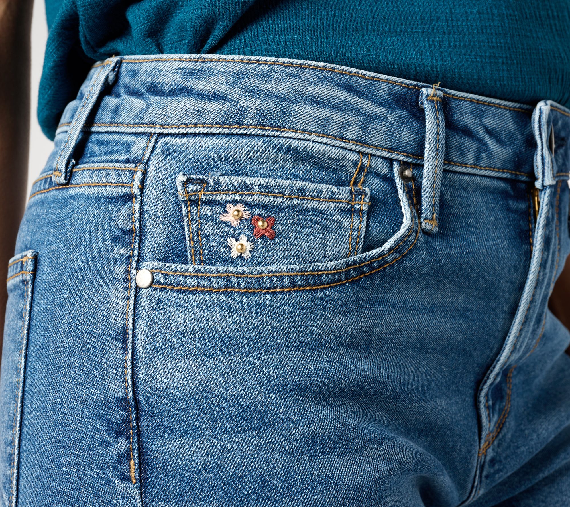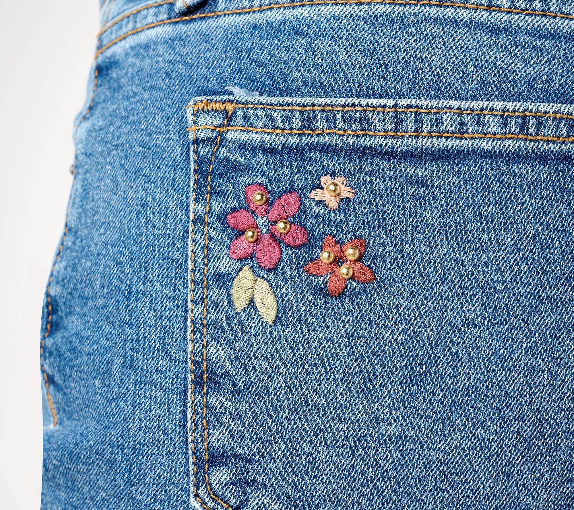 Features: embroidered design, five pockets, full length, finished hem