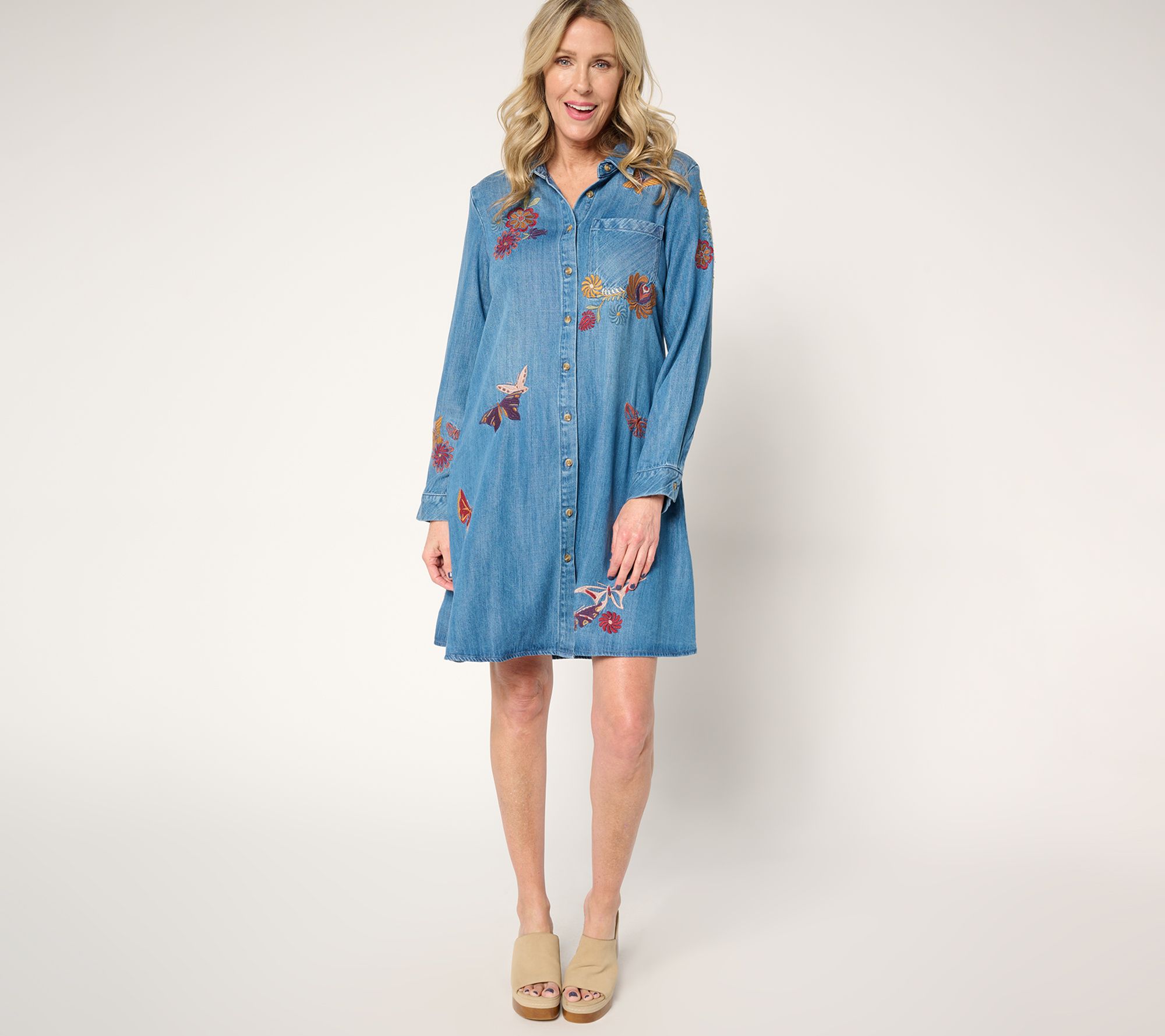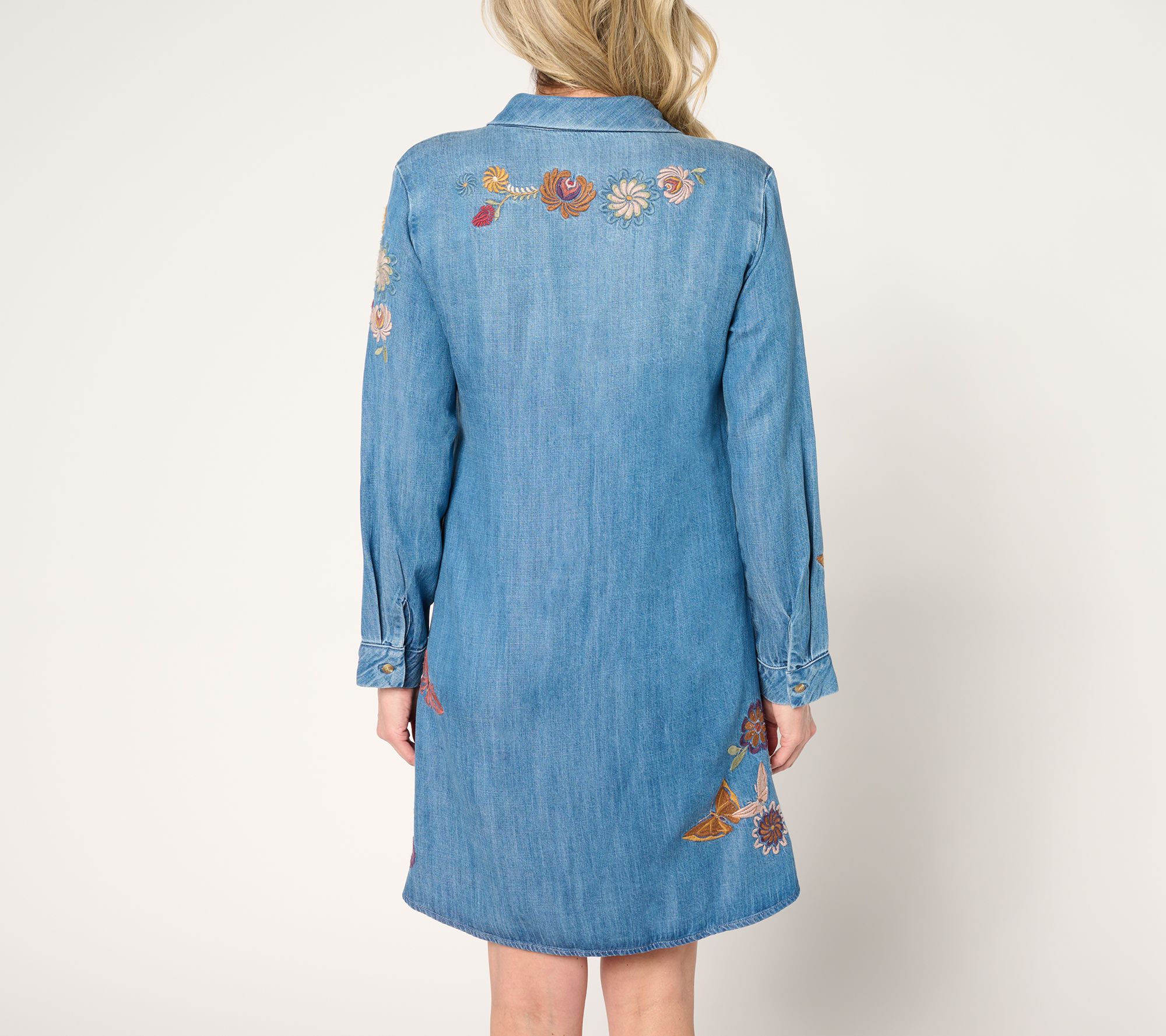 Features: embroidered butterfly motif, A-line silhouette, button-front closure, left chest pocket, long sleeves, button cuffs, finished bottom hem