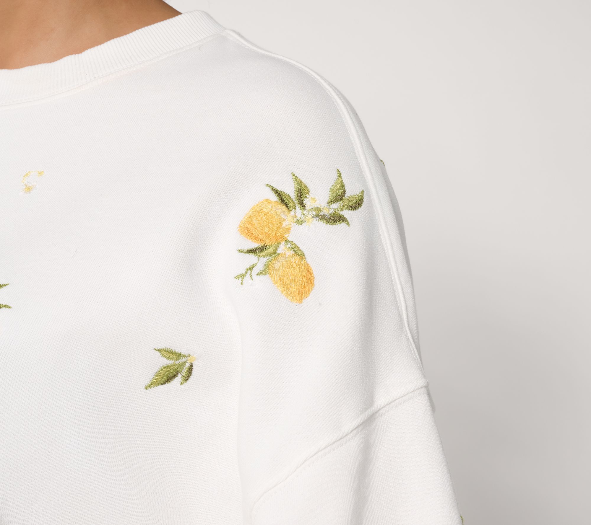• Features: teddy crew neck, embroidered design, long sleeves, drop shoulder, rib at sleeve cuff and bottom opening