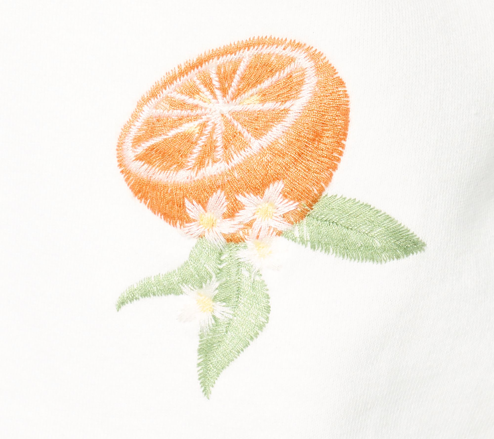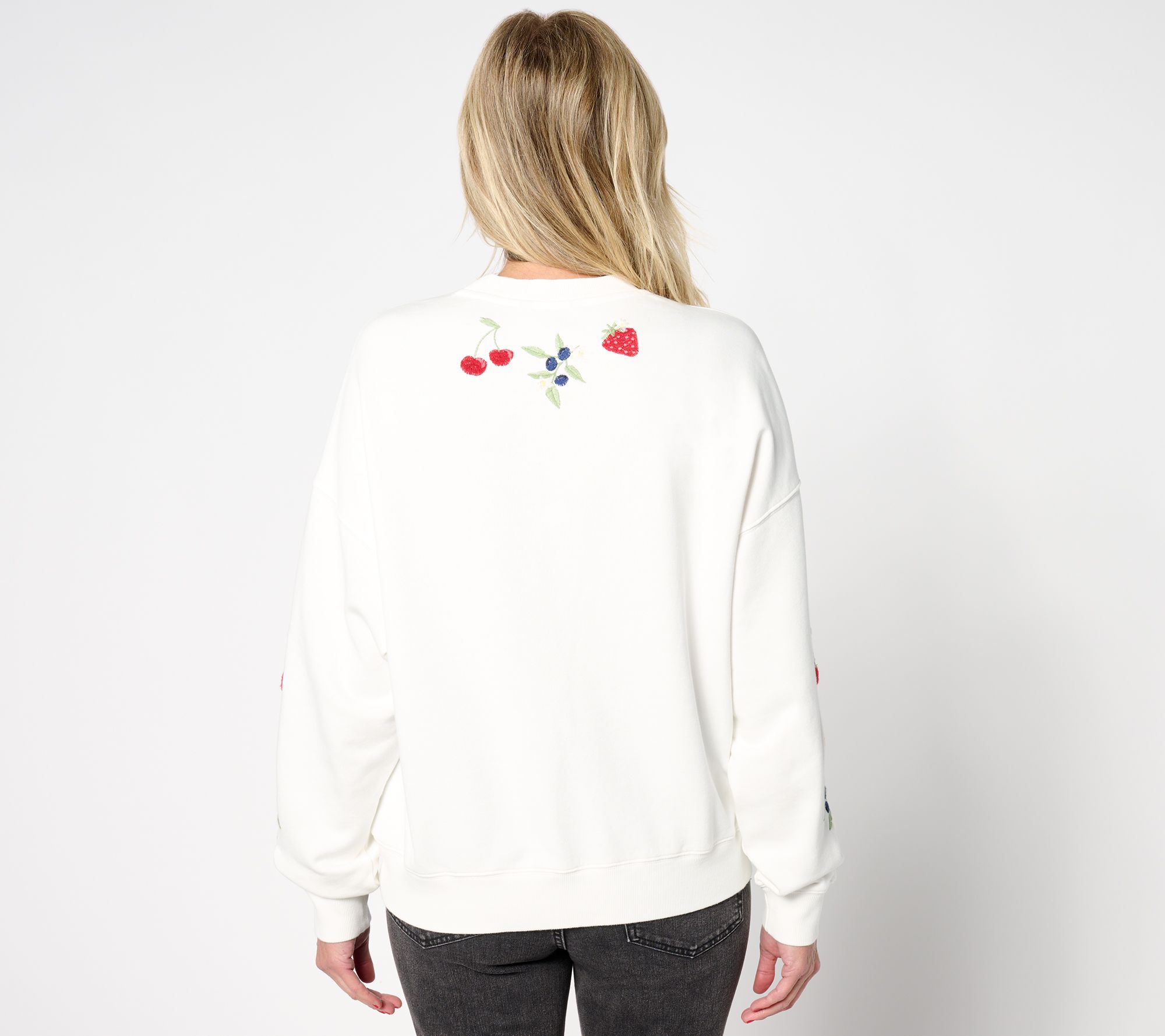 Features: embroidered fruit design, crew neckline, pullover style, drop shoulder, long sleeves, ribbed cuffs and bottom hem
