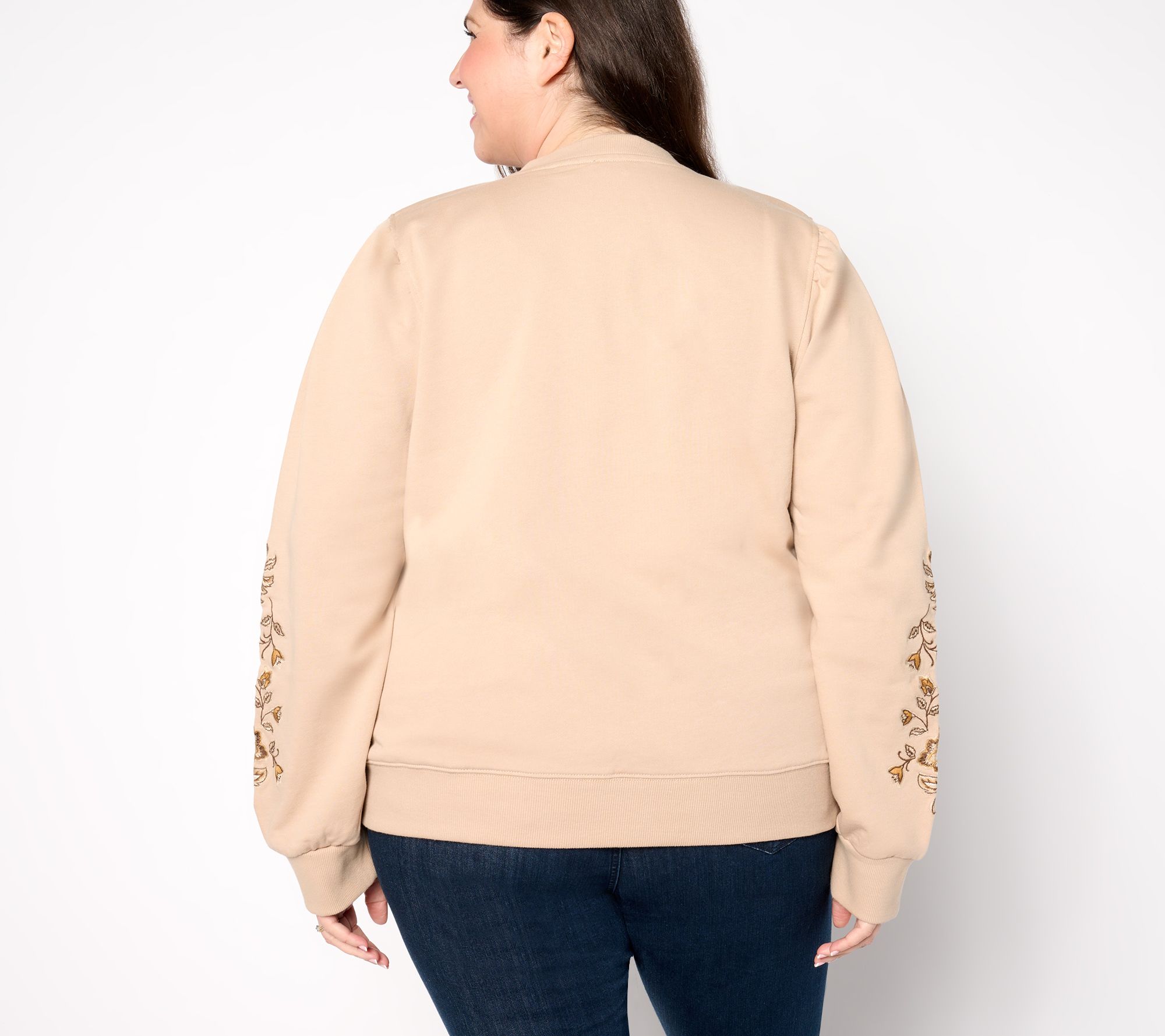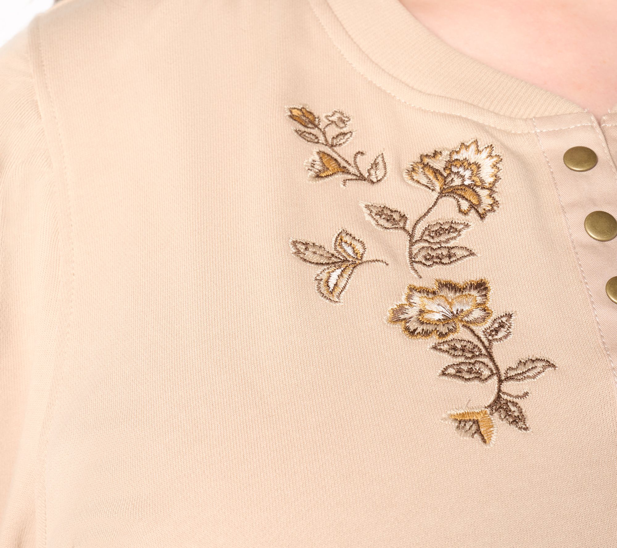 Features: half placket with snaps, embroidered design, set-in shoulders, ribbed at sleeve cuff and bottom opening