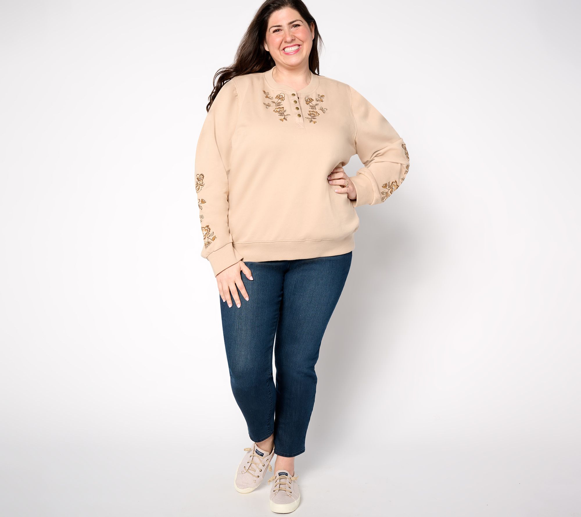 Crafted of soft French Terry, this classic henley top get the glam treatment with an elegant, embroidered design. Team it with straight-leg jeans and ankle boots for an elevated take on casual style. From Driftwood Jeans.
