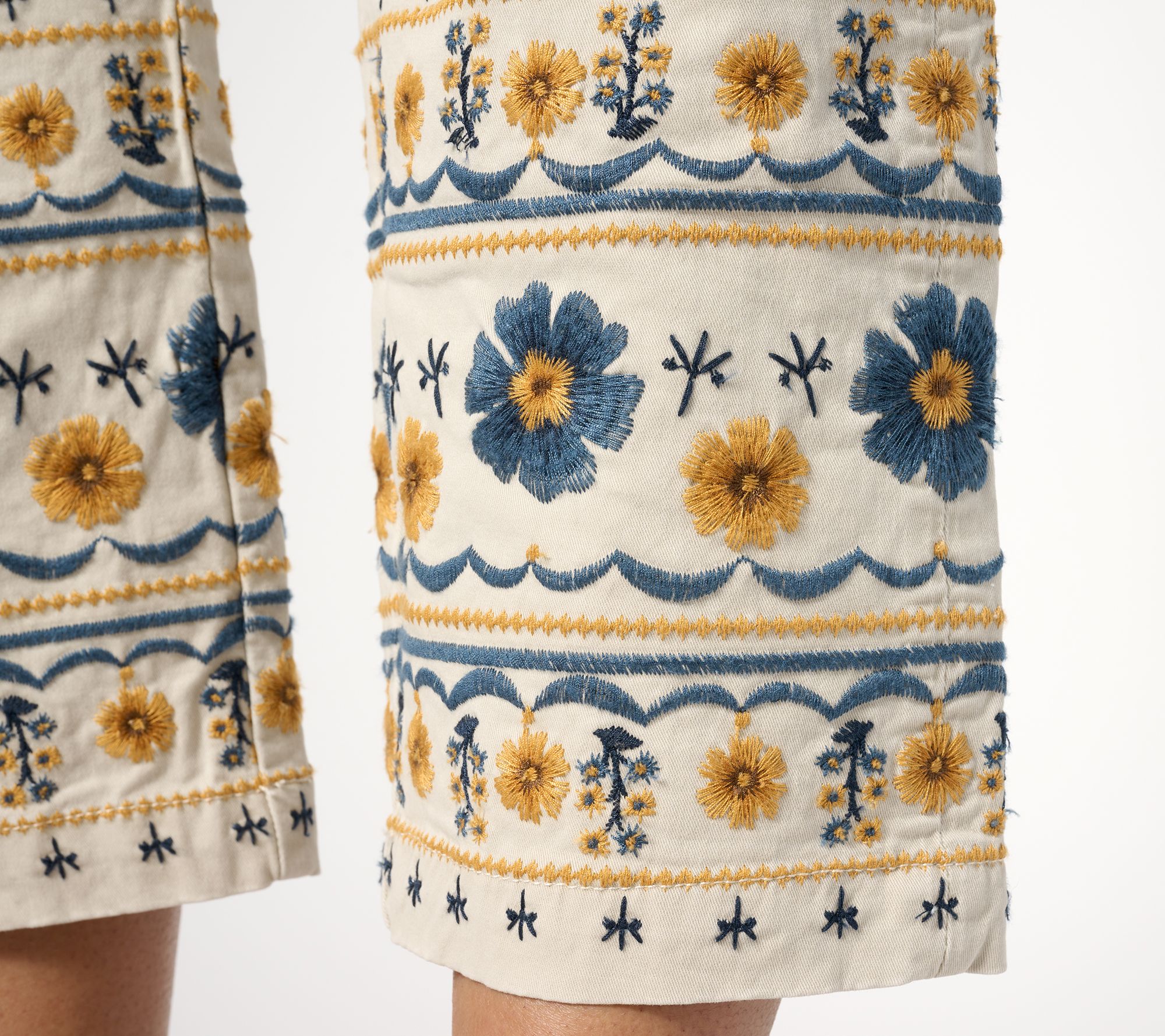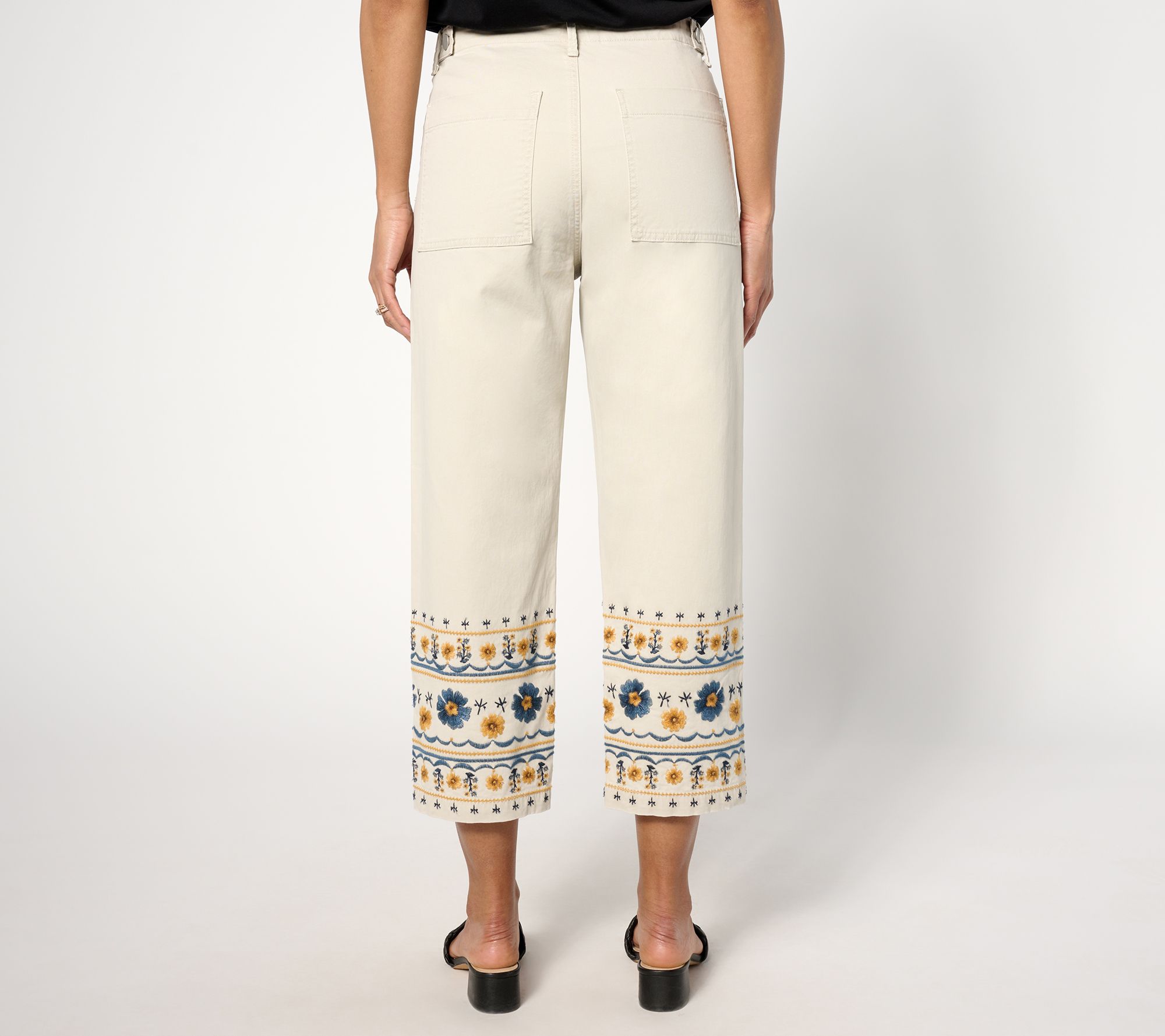 Stitch a statement look together with these relaxed-fit boyfriend crops. Fun floral embroidery customizes these utility-style pants with your own brand of personal flair. From Driftwood Jeans.