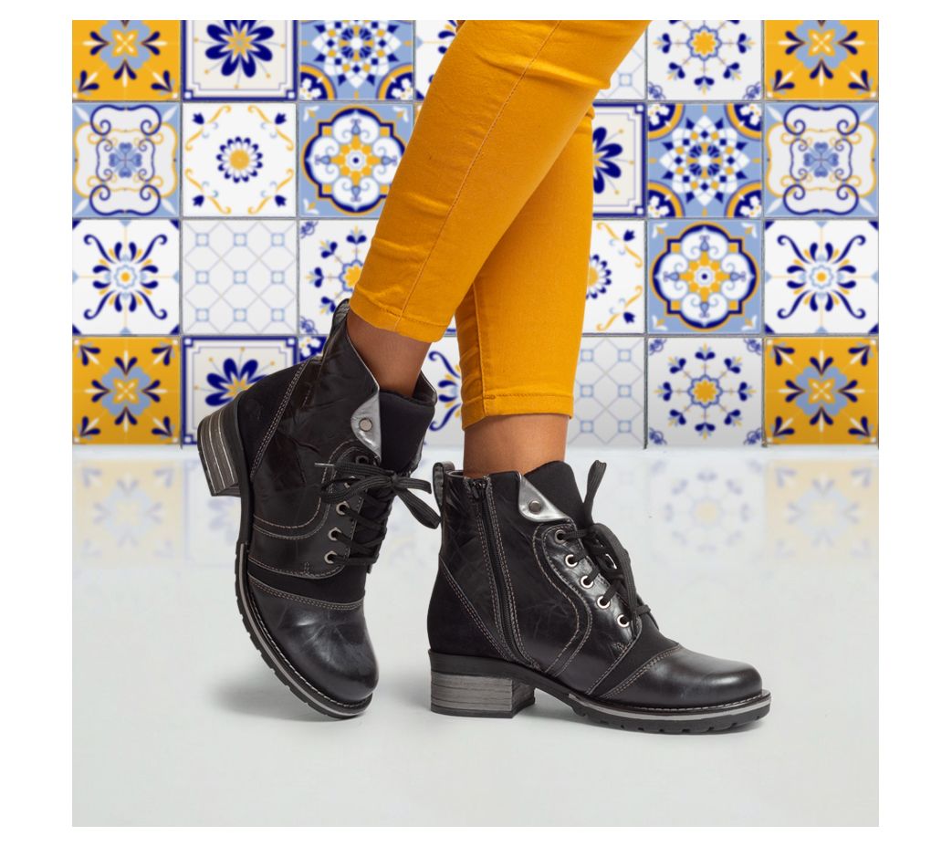 Lace-up design; inside zipper; brushed, waxy finish with twisted, creased effect; metallic trim; stitching detail; suede heel counter and tongue