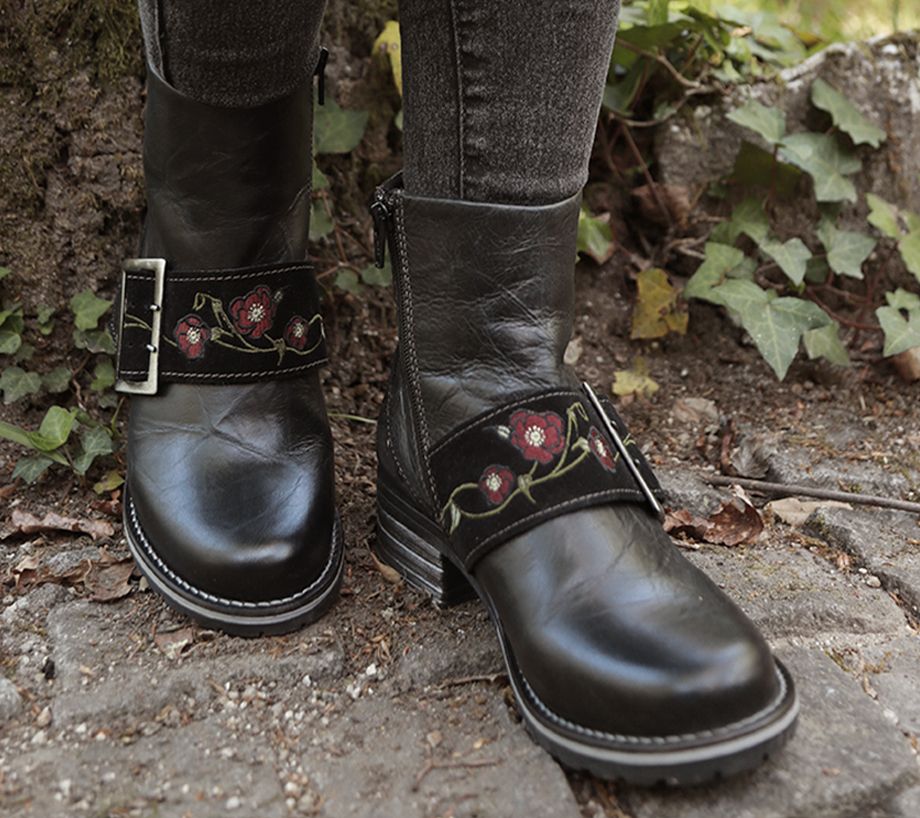 These leather boots were tanned, twisted, and brushed for a stylish effect, and provide soft, stable support for a comfortable feel. From Dromedaris.