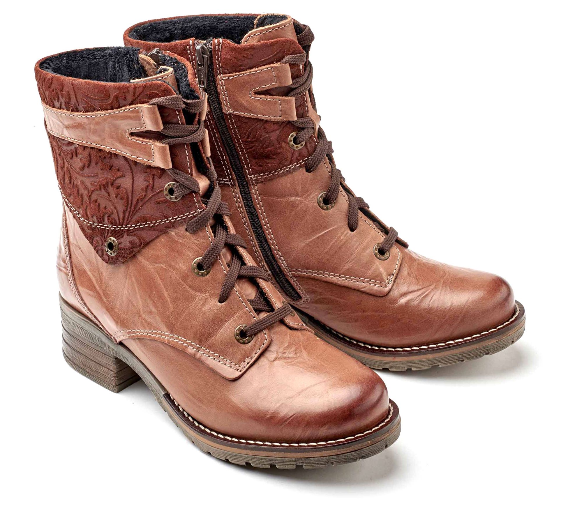 • Lace-up styling; round toe; inside zipper; leather welt with heavy stitch; brushed waxy finish; faux-fur lining; printed leather cuff