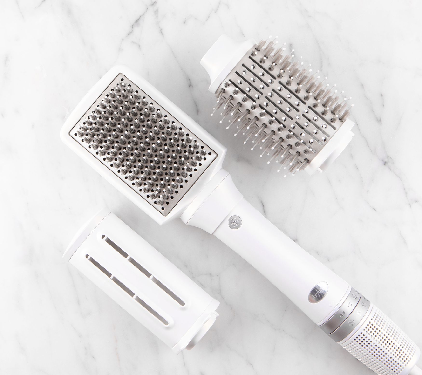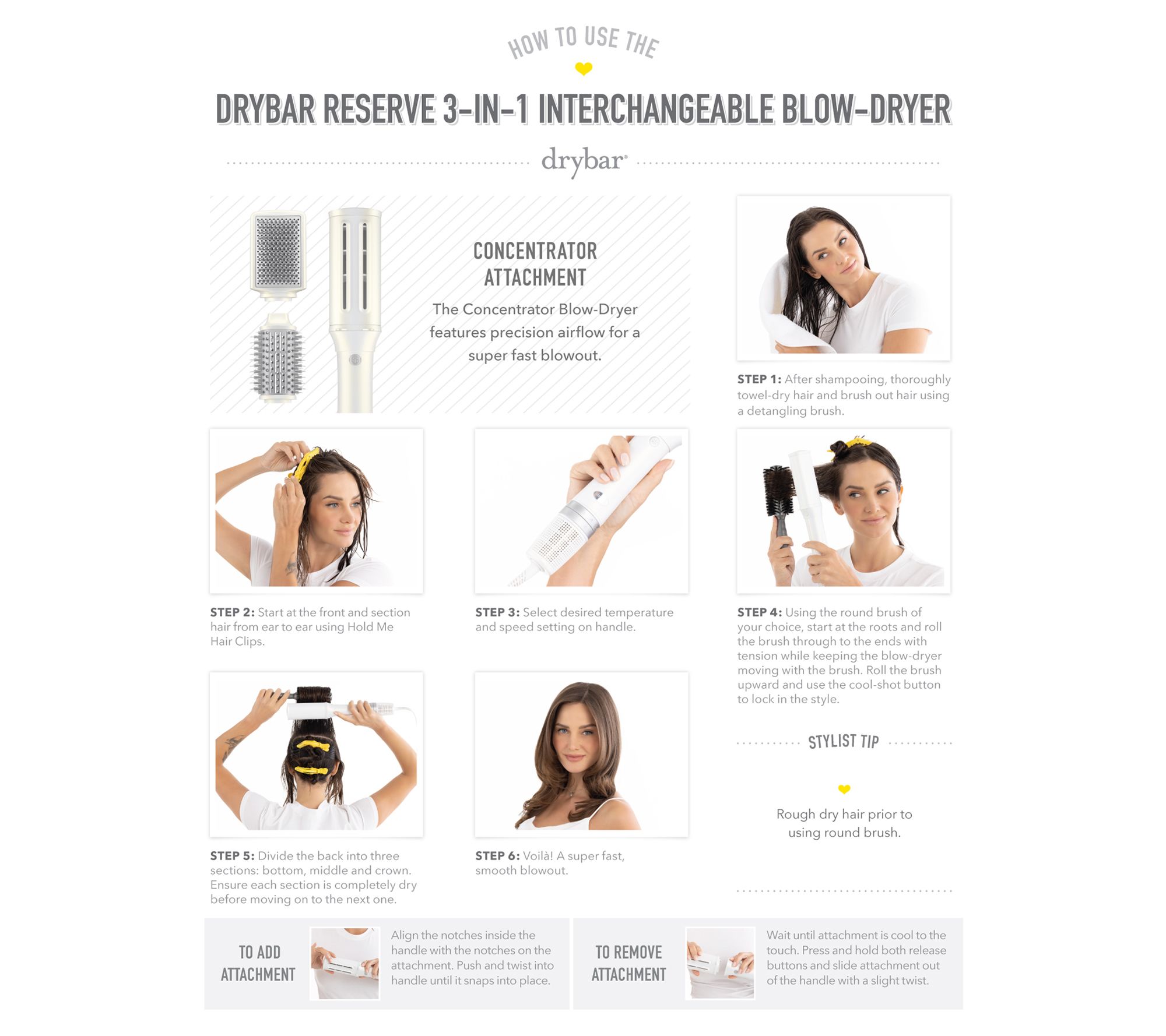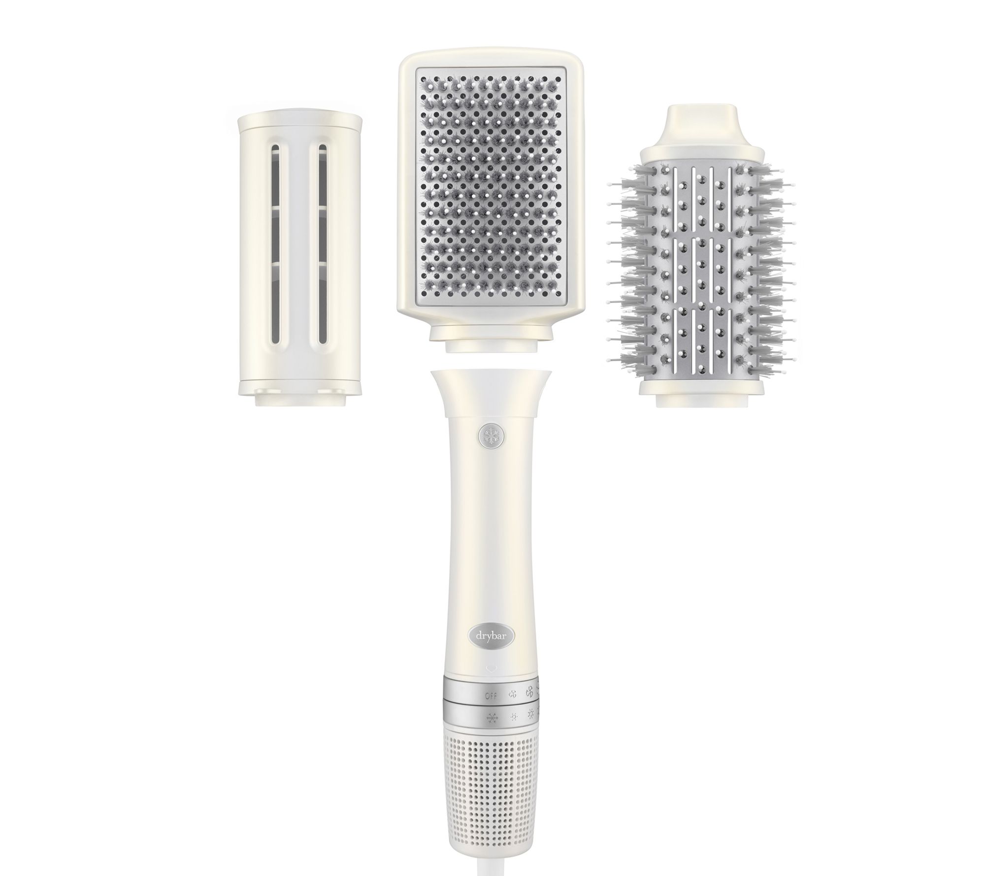 Reserve 3-in-1 Interchangeable Blow-Dryer from Drybar is an ultralight 3-in-1 blow-dryer with three interchangeable attachments that creates a variety of customized blowout styles. Blow-Dryer attachment features precision airflow for a super-fast blowout. Oval Brush attachment provides tons of volume with a smooth, shiny finish. Paddle Brush attachment creates a sleek and straight blowout.
